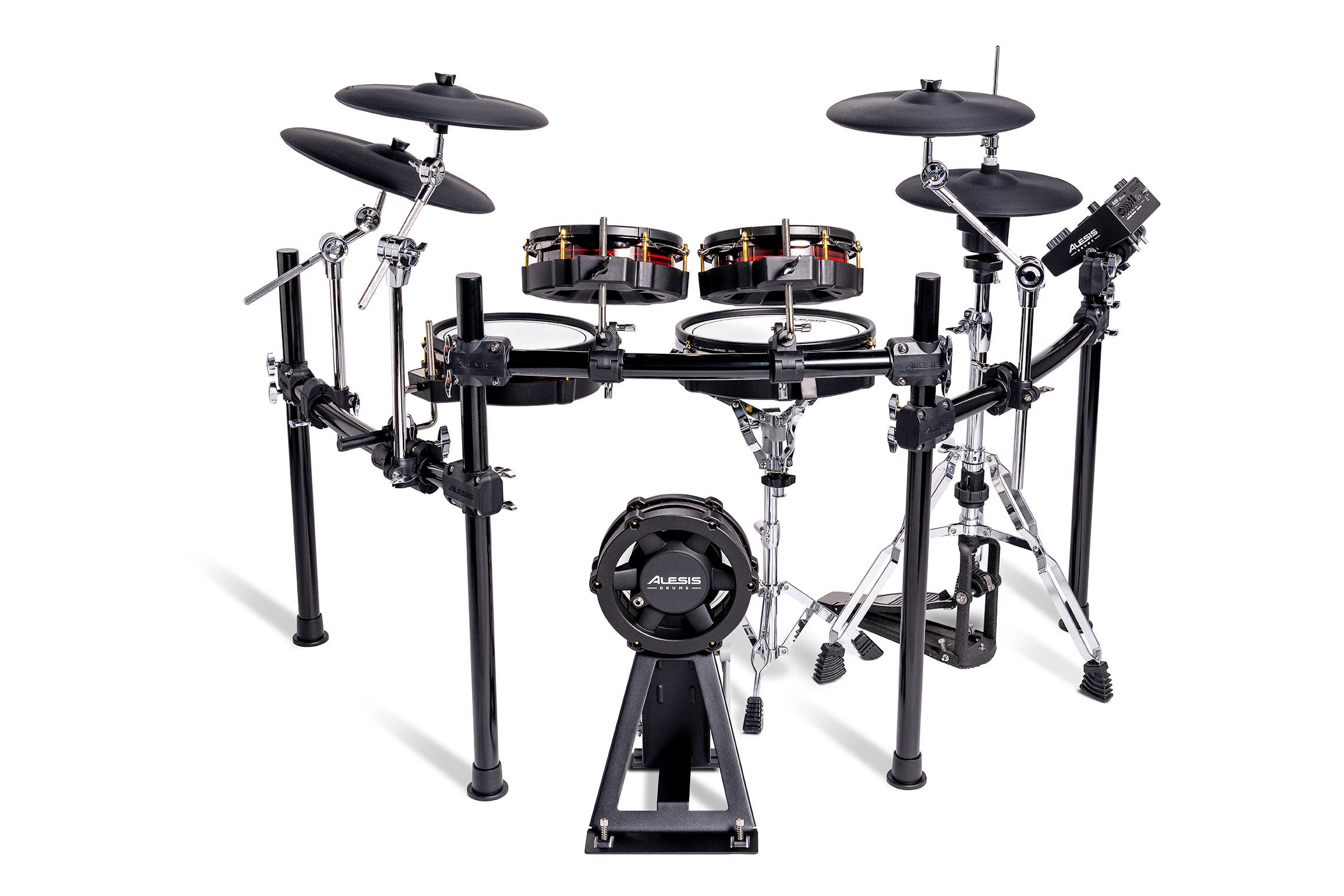 The backbone of Strata Core is a curved steel rack where the toms, cymbals and module are mounted. Sturdy but flexible, it allows for spacious and compact footprints so you can adjust the kit to your ideal playing position for your setup. The ARC hi-hats mount to any hi-hat stand, and the 8" kick tower can accommodate any single or double pedal configuration. Crash and ride cymbals can be mounted to standard acoustic cymbal stands and are not bound to the rack mounts.