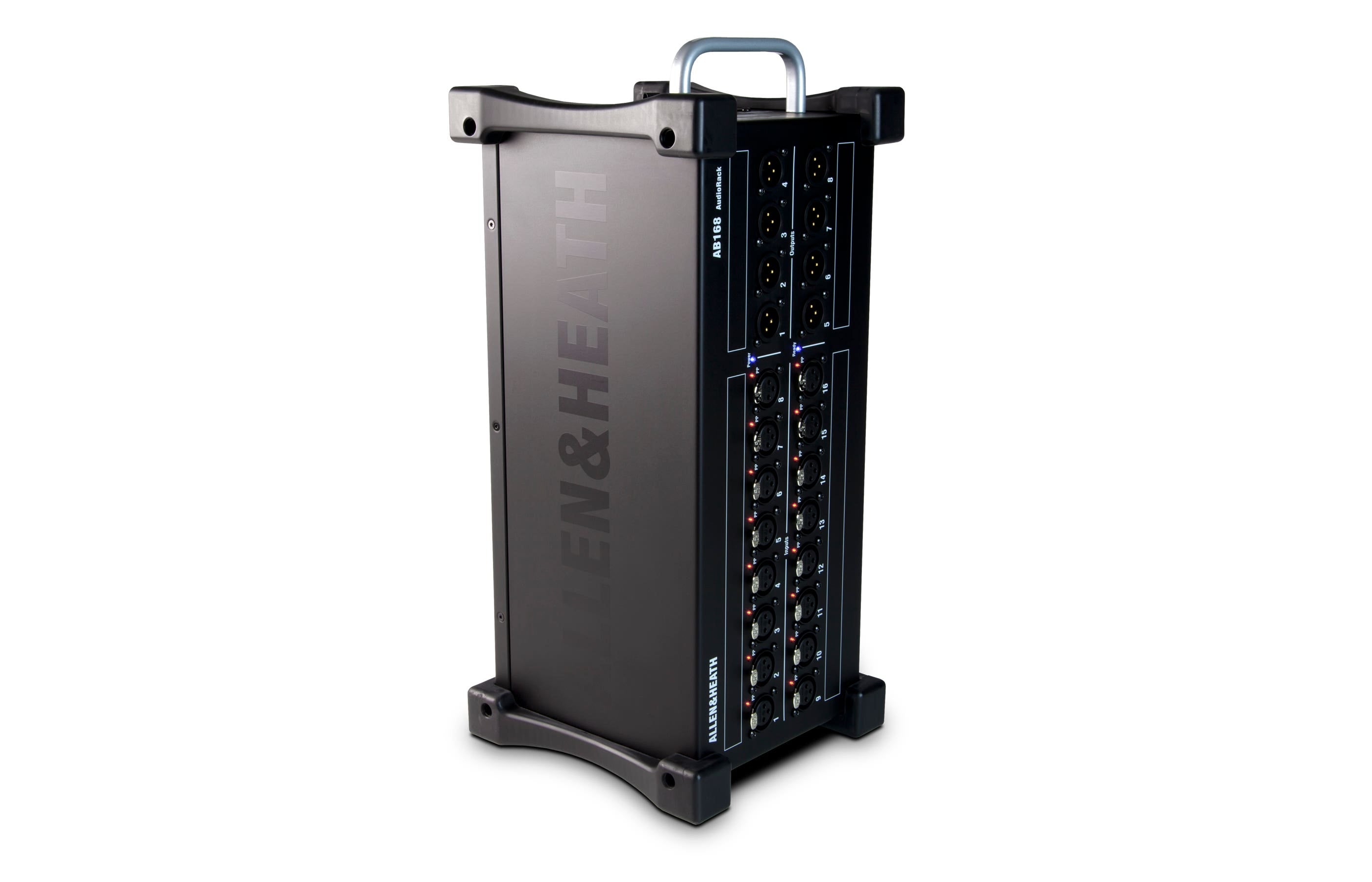 AB168 is a portable AudioRack, providing 16 XLR inputs and 8 XLR outputs when connected to a GLD-80 or GLD-112 mixer, or to an AR2412 AudioRack. Featuring 16 mic preamps with Phantom Power indicators and 8 XLR line outs, AB168 runs on Allen & Heath’s proprietary dSNAKE protocol. The AB168 unit connects over a single Cat5 cable to the GLD mixer or to an AR2412 AudioRack via a secure dSNAKE EtherCon port. A second EtherCon port is provided for daisy-chaining to another AB168 box or connection of a ME personal mixing system. AB168 auto updates its firmware to synchronise with the GLD system.