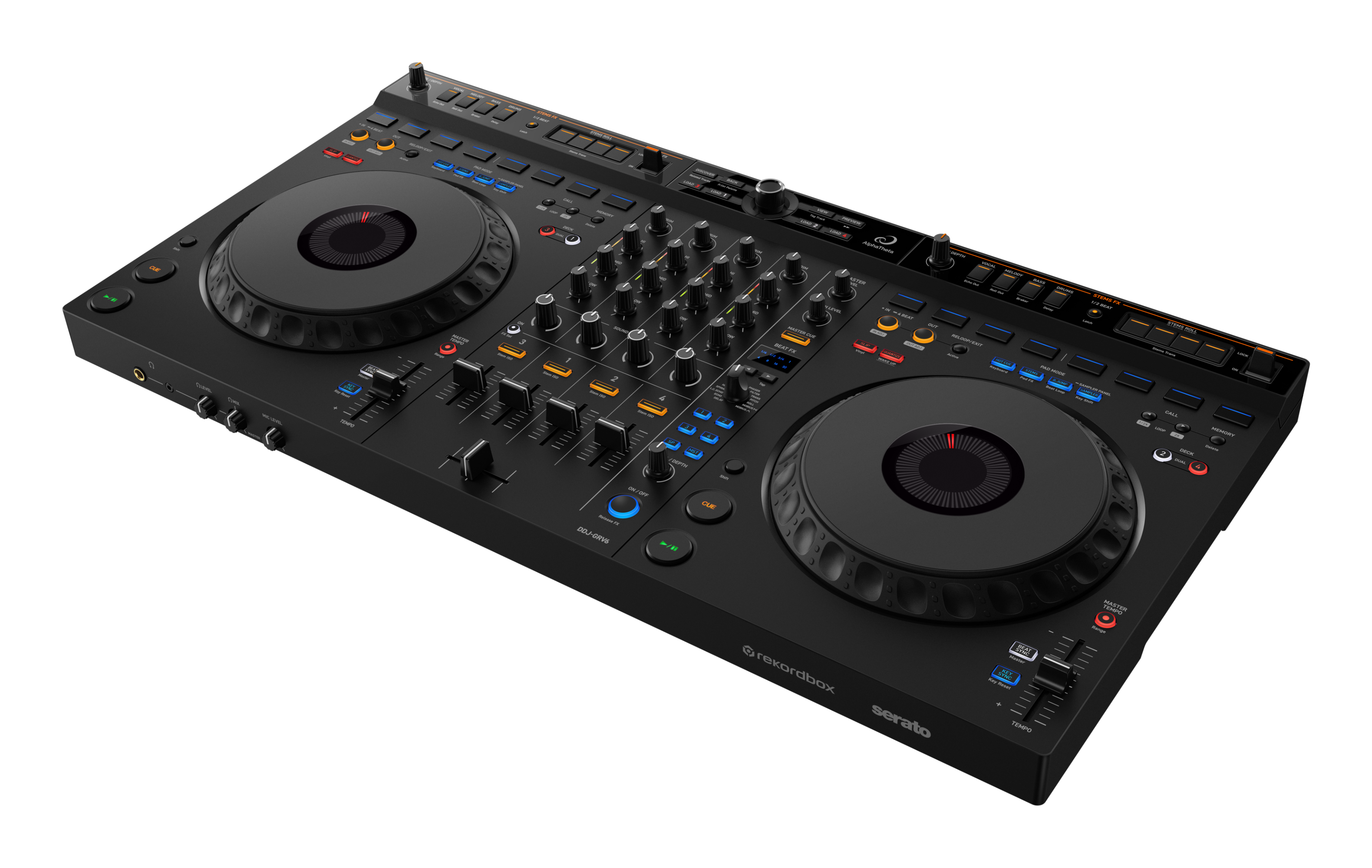 The DDJ-GRV6 is compatible with Serato DJ Pro, which includes a Stems FX feature. Express yourself musically by applying effects such as Roll, Trans, Echo Out, and Delay to the separate Stems of a track – drums, bass, vocal, or melody. Apply the overlay sheet included with the DDJ-GRV6 to change the button labels to Stems FX for ease of use. Multi-device compatibility: DJ with your PC/Mac, mobile device, and more