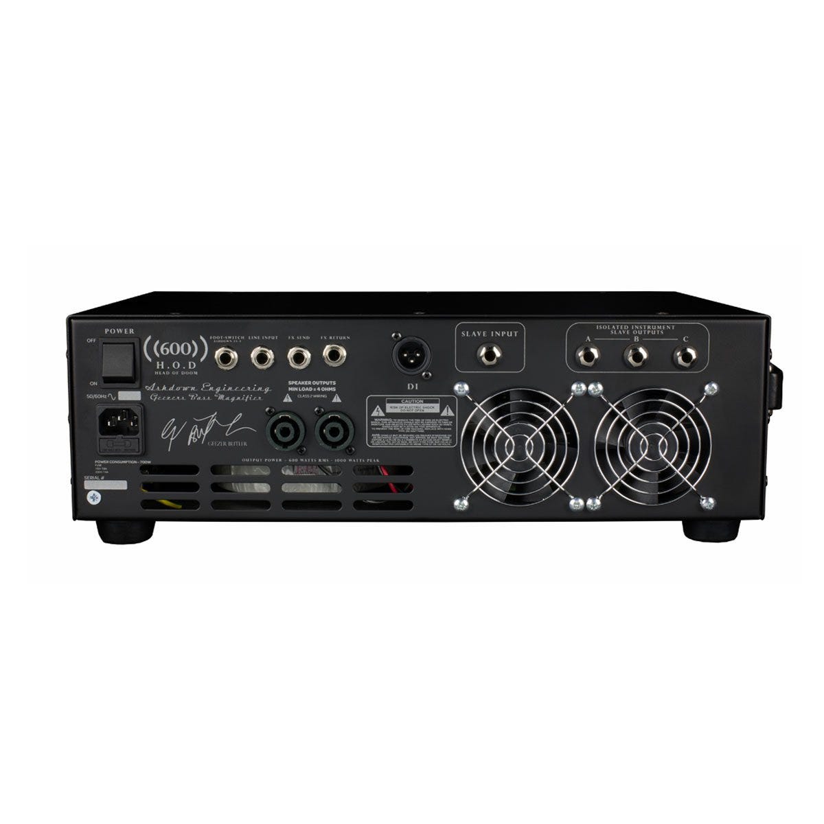 The Head of Doom has a deadly power section rated at 600 Watts RMS with two Neutrik speakon outputs. The power section has a minimum load of 4 ohms. The slave input on the rear is designed to be fed by the transformer-isolated outputs if running multiple heads from one input source. More heads - more doom!