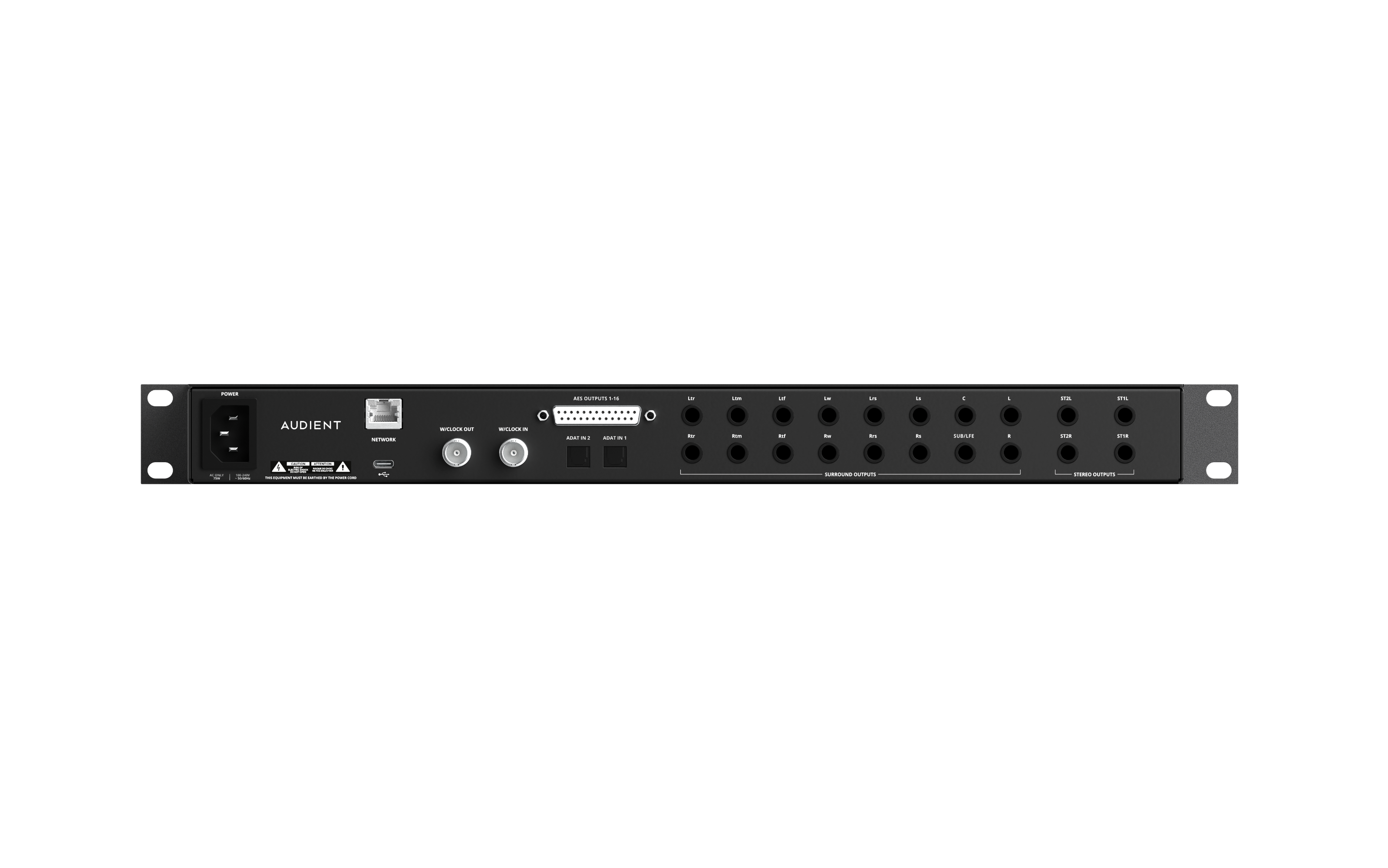 ● Surround Outputs ○ 16 Balanced Analog Outputs for up to 9.1.6 monitoring. ● AES Outputs ○ 8 pairs of AES Digital Outputs for interfacing with Digital Speakers. ● Dedicated Stereo Outputs ○ Dedicated stereo outputs for non-immersive integrated near fields. ● Word Clock Input and Output ○ BNC connections for integration into larger installations. ● ADAT Inputs ○ 16 ADAT input channels for use as an external 9.1.6 monitor controller or traditional multi-channel recording. ● Optional Dante Inputs ○ Integrate into AoIP workflows with the optional Dante Card.