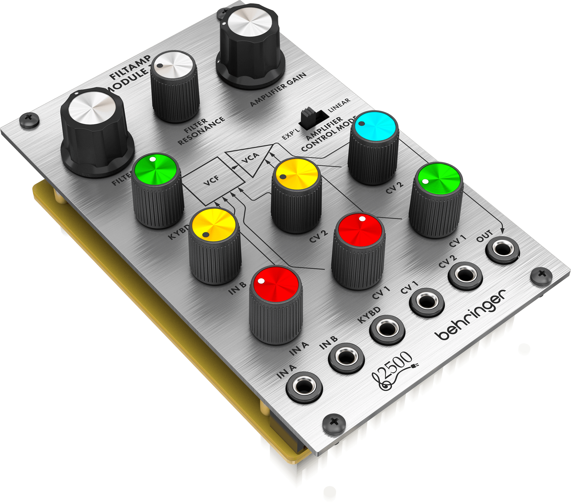 The VCA has an amplifier gain control which is summed with the CV inputs, an exponential or linear response switch and 2 summed CV inputs with attenuators. All this lets you shape your sound to perfection.