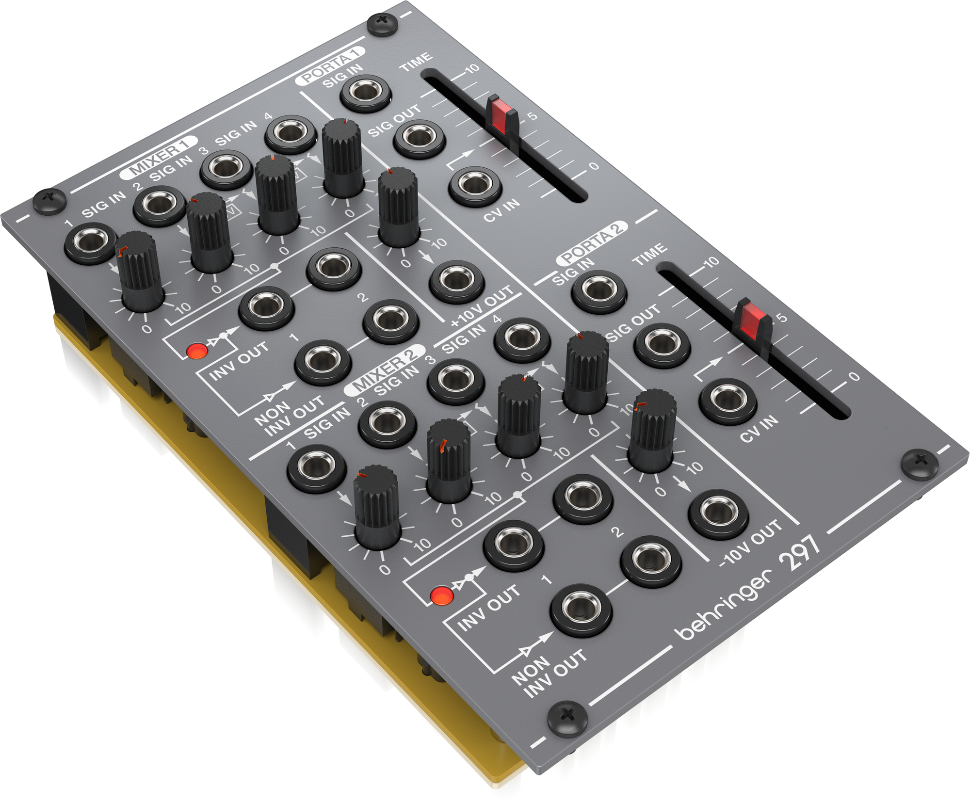 The 297 features two independent mixers for CV signals. These come with four inputs, each with their own attenuators, where you can connect incoming signals from various different sources. The CV mixers also allow you to send mixes of inputs 1-4 in inverted and non-inverted versions for extra versatility.