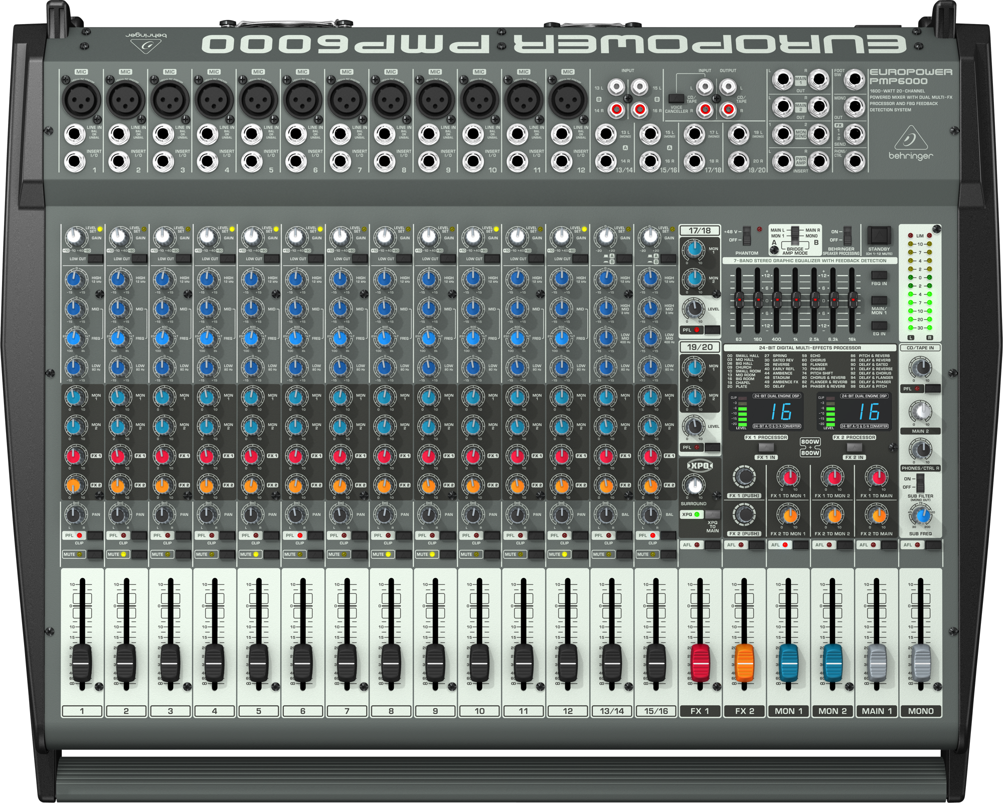 The amazing PMP6000 Powered Mixer packs tremendous power (2 x 800 Watts stereo or 1,600 Watts in Bridged mode), while maintaining an incredible power-to-weight ratio. These mixers employ high-efficiency Class-D technology and a state-of-the-art switch-mode power supply, which significantly reduces weight and heat. The 20-channel PMP6000 features 12 built-in, studio-grade XENYX mic preamps, 4 stereo channels, dual 24-bit Multi-FX processors with 100 awesome presets including studio-class reverbs, delays, pitch shifter and various multi-effects, plus a 7-band stereo graphic EQ with our proprietary FBQ Feedback Detection System – for the ultimate in feedback free performance. Class-D - Massive Power, Perfect Sound Thanks to our revolutionary Class-D amplifier technology, we are able to provide you with enormous power and incredible sonic performance in an easy-to-use, ultra-portable and lightweight package. Class-D amplification makes all the difference, offering the ultimate in energy efficiency – and eliminating the need for heavy power supplies and massive heat sinks. This amazing technology makes it possible to design and build extremely powerful products that are significantly lighter in weight than their traditional counterparts, while using less energy and protecting the environment.
