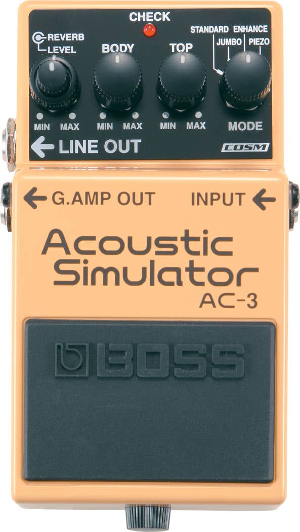 Advanced Modeling BOSS’s COSM Acoustic-Modeling technology is beautifully showcased in this small but powerful pedal, which simulates an acoustic guitar much more precisely and realistically than previous technology allowed. Derived from BOSS top-of-the-line AD-8, the AC-3 simulates the sound of an acoustic guitar with incredible precision. Four simulation modes are provided: Standard, Jumbo, Enhanced, and Piezo-equipped; the latter supplies that famous cut through the mix” direct piezo sound. Previous compact acoustic-guitar modeling-pedals were promising, but now the bar has been raised with AC-3.