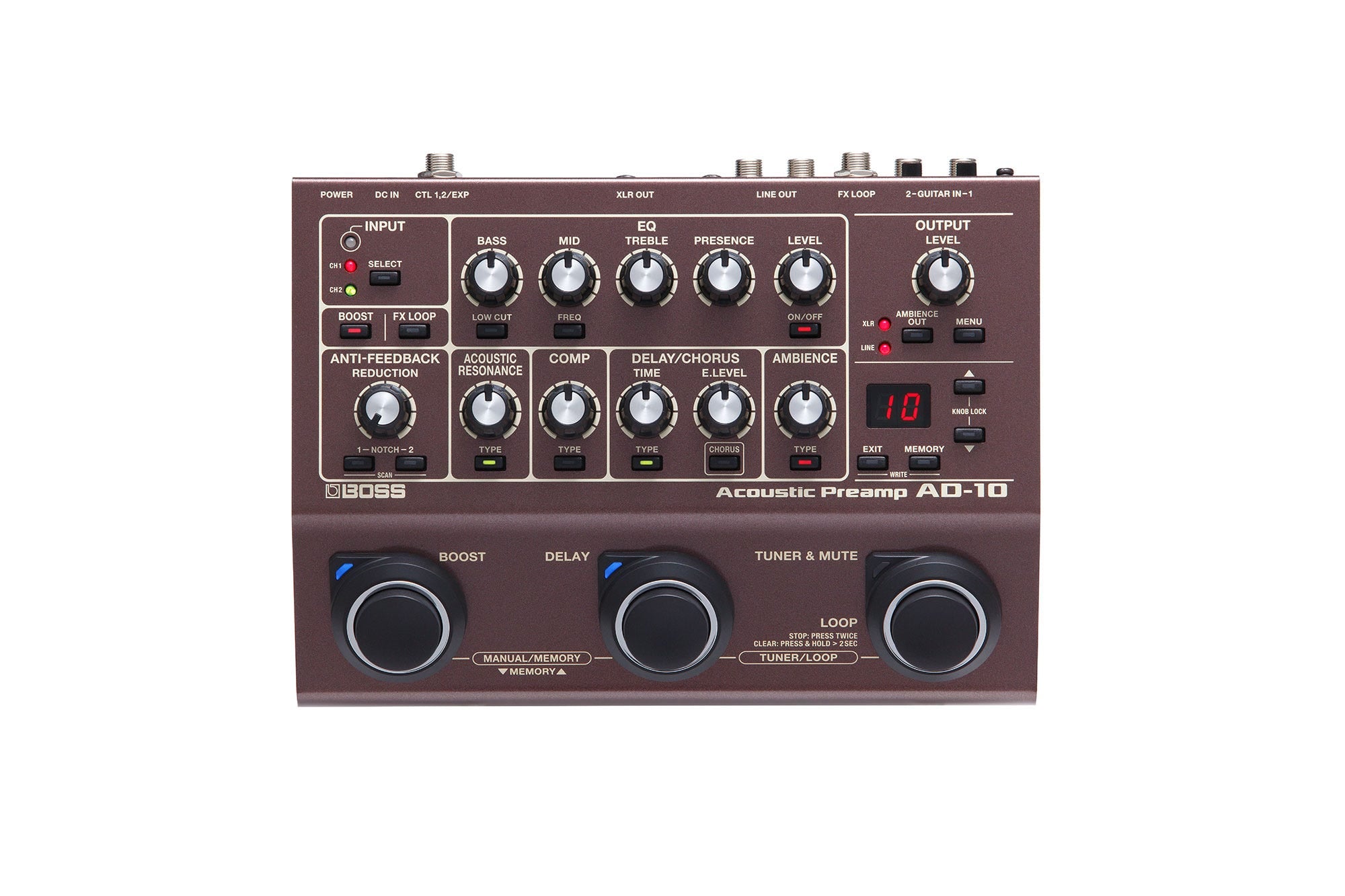 Anyone who plays an amplified acoustic guitar on stage knows what a challenge it is to get a sound that’s as inspiring as playing the instrument acoustically. The AD-10 is your solution to this age-old problem, offering advanced sound tools that enable you to achieve rich, natural acoustic tones every time you perform. At its core, the AD-10 is a fully featured, dual-channel acoustic preamp/DI pedal with premium audio quality, deep sound-shaping options, and flexible connectivity. On top of that, ambience, chorus, and delay effects are built in, eliminating the need to carry external sound processing.