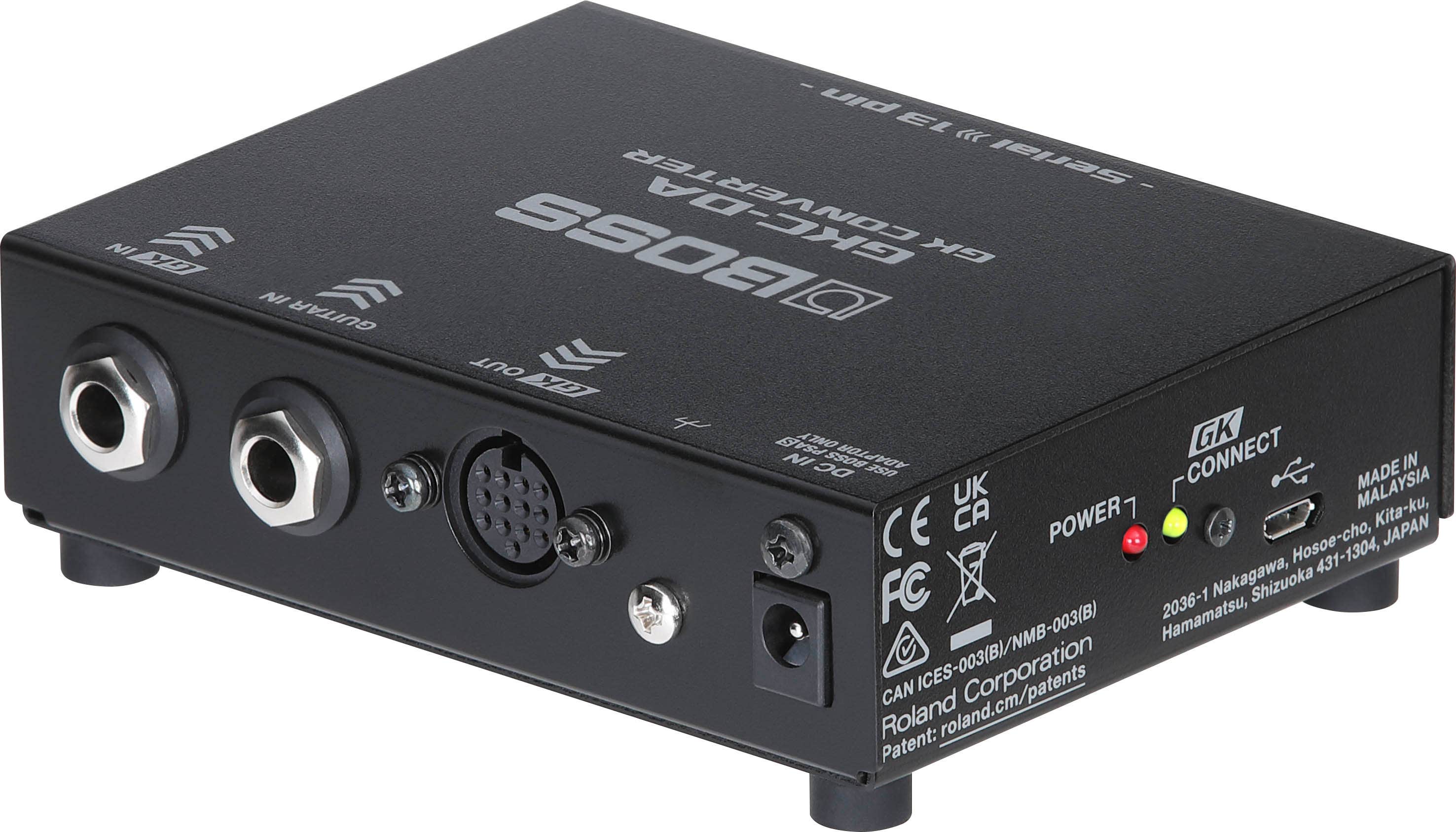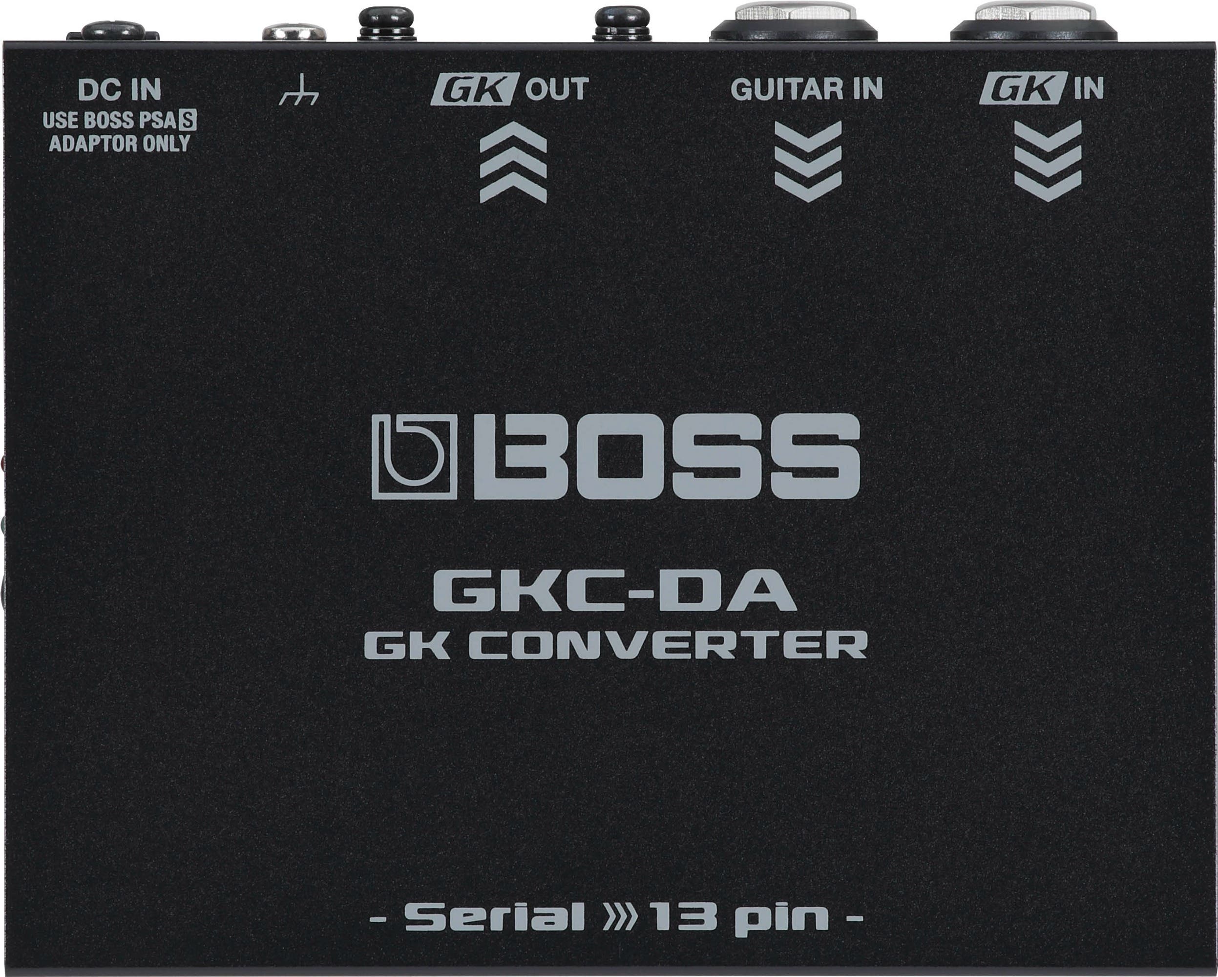 The latest BOSS guitar synthesizer products feature the Serial GK digital interface, a newly developed connection method that delivers evolved performance over the analog 13-pin GK interface used in earlier BOSS and Roland guitar synth and modeling products. The GKC-DA GK Converter allows you to drive a 13-pin GK device such as the BOSS SY-1000 or GP-10 using the Serial GK output on a GK-5 or GK-5B Divided Pickup or the GM-800 Guitar Synthesizer.