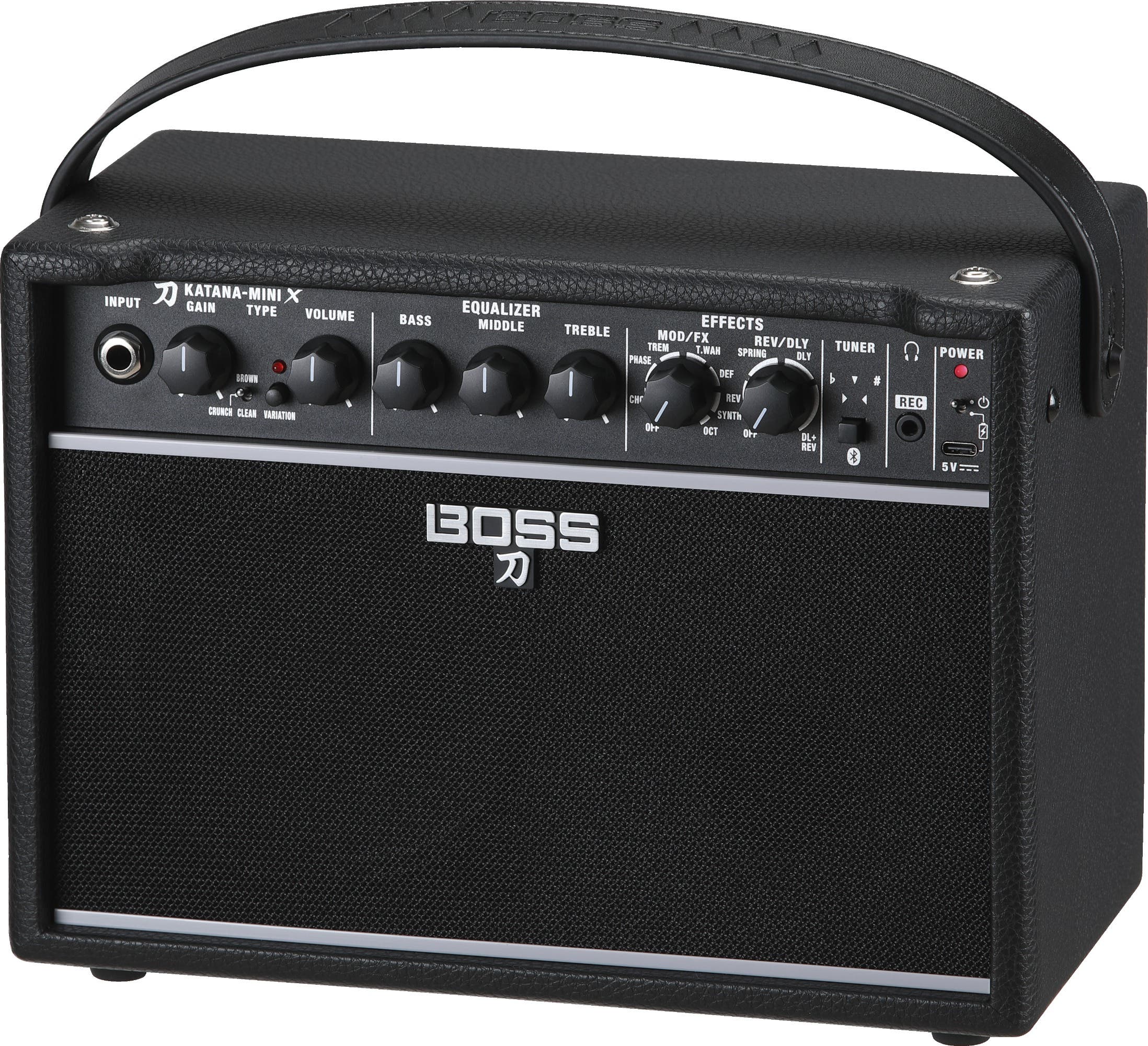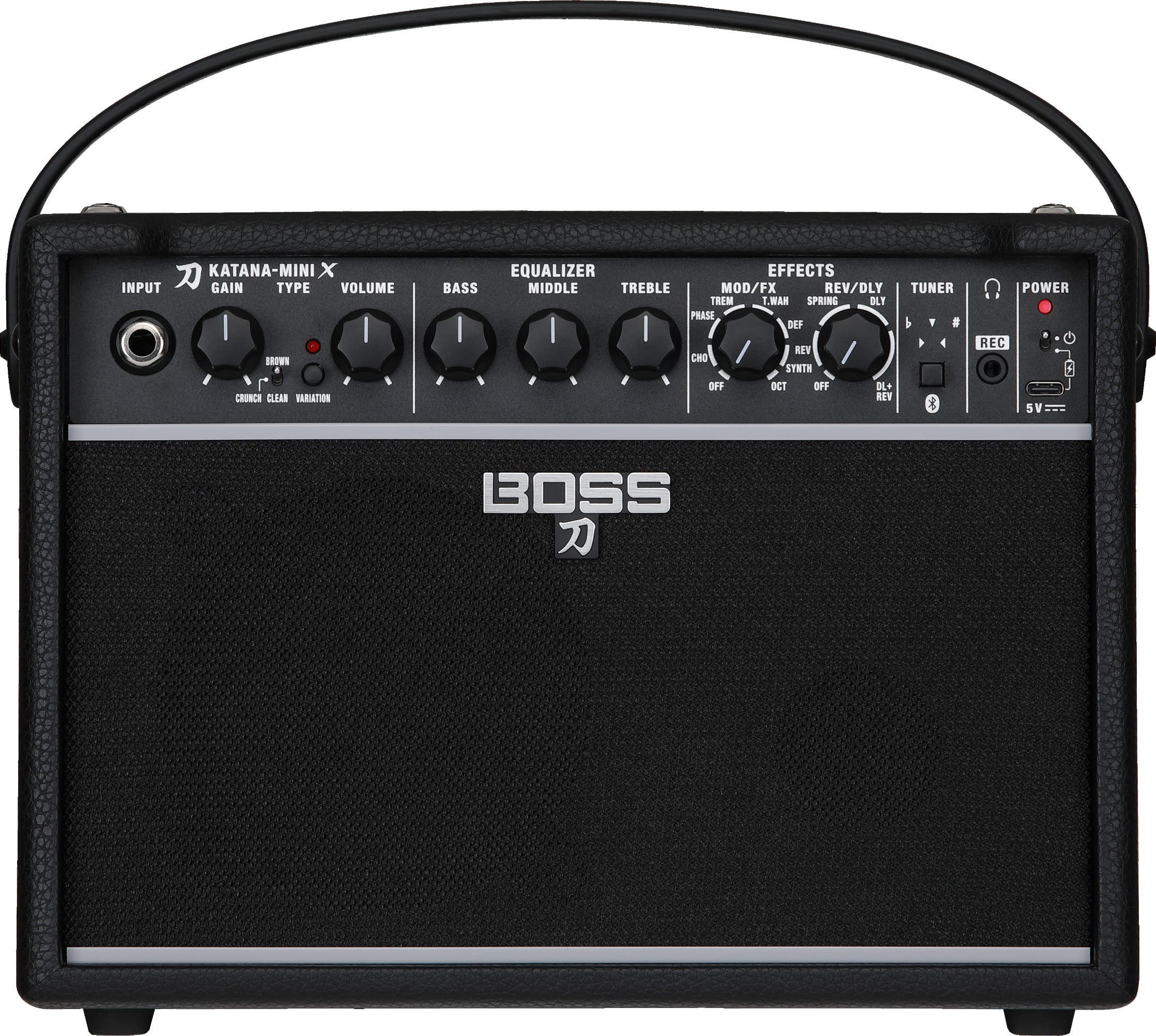 Katana-Mini X features a traditional analog tone stack for natural sound shaping using familiar bass, mid, and treble controls. MOD/FX and REV/DLY sections are also on hand, each with a diverse range of BOSS effects and fast sound tweaks via single-knob controls that adjust multiple parameters at once. Both sections can be used simultaneously, letting you create combinations such as tremolo and spring reverb, phaser and delay, and many others.
