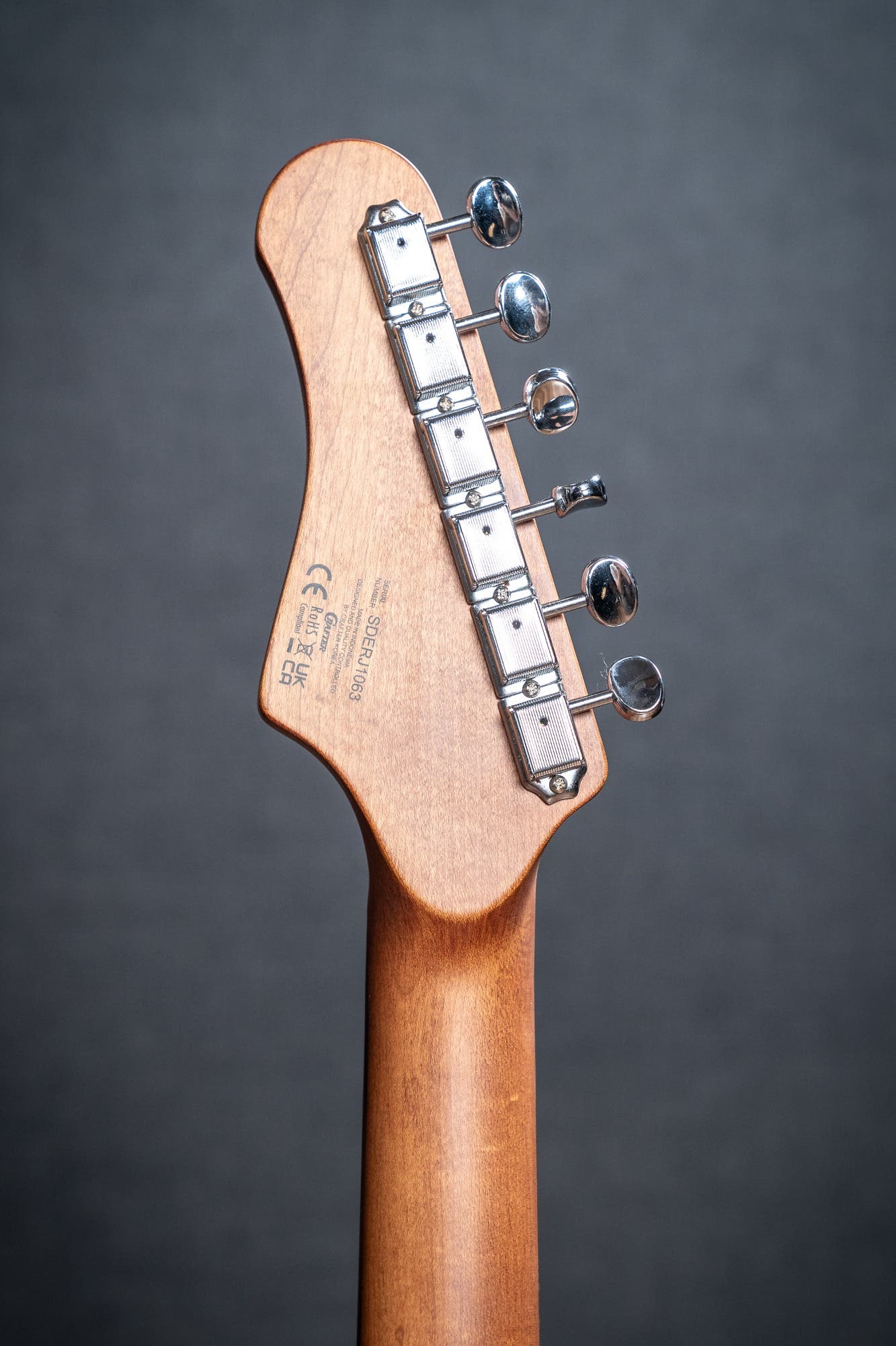 The Crema series has the ‘modern vintage look’. The tortoise pickguard with the vintage ivory pick up cover & the buttons make the guitar look gorgeous. And the well-CNC machined brass saddle offers special sound and look on the mahogany body. The vintage case machine heads bring more of that vintage vibe to it. The Crema series makes its own voice with the “Crema” HSS Alnico 5 Pickup ST Electroncis Set designed by MUSICIANS CLUB with its brass saddle and the stainless frets. And the quality 2points bridge supports the player.