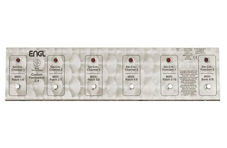 The Z-9 Footswitch can serve as a simple MIDI controller with 10 memory slots or for ENGL amps with S.A.C. operate the Channel switching and other features. Power is supplied via MIDI cable, power supply or S.A.C. interface.