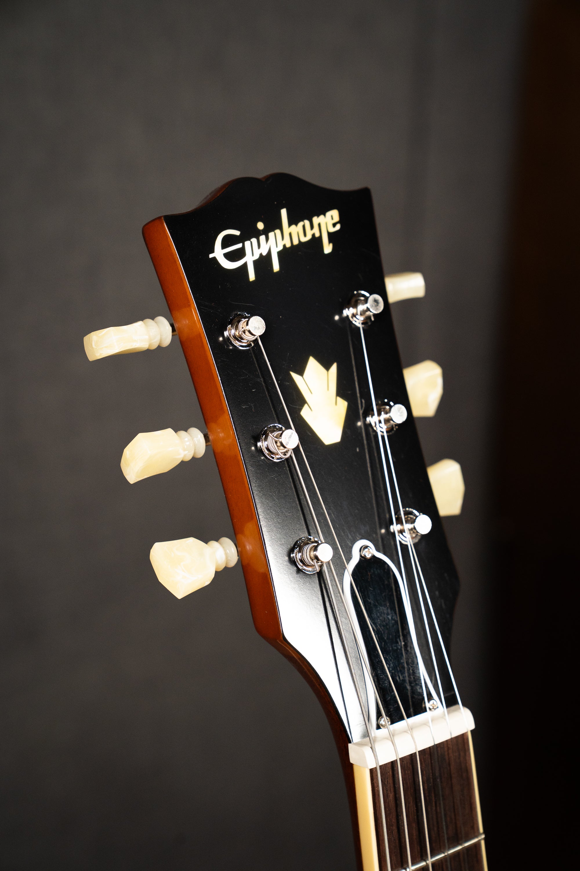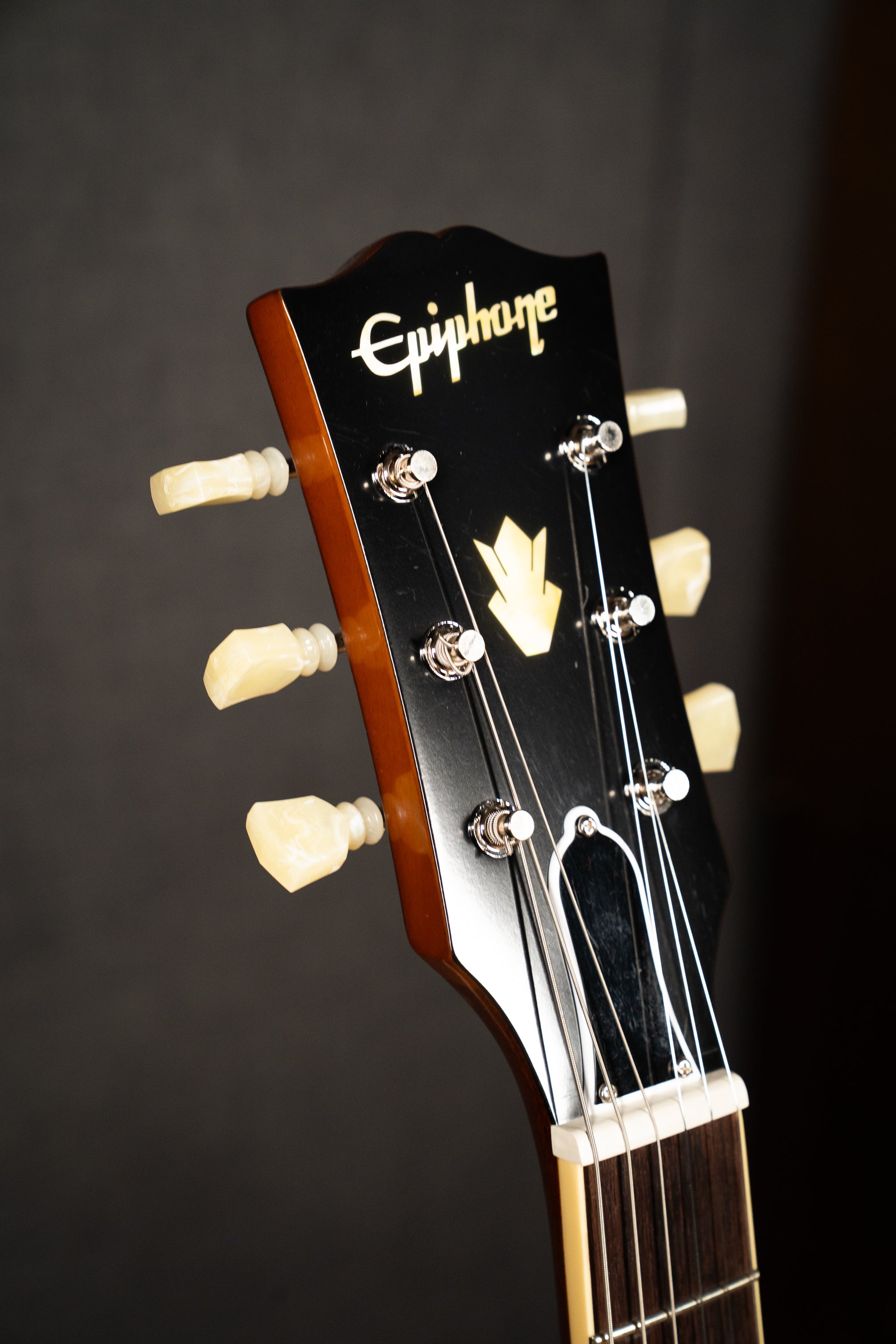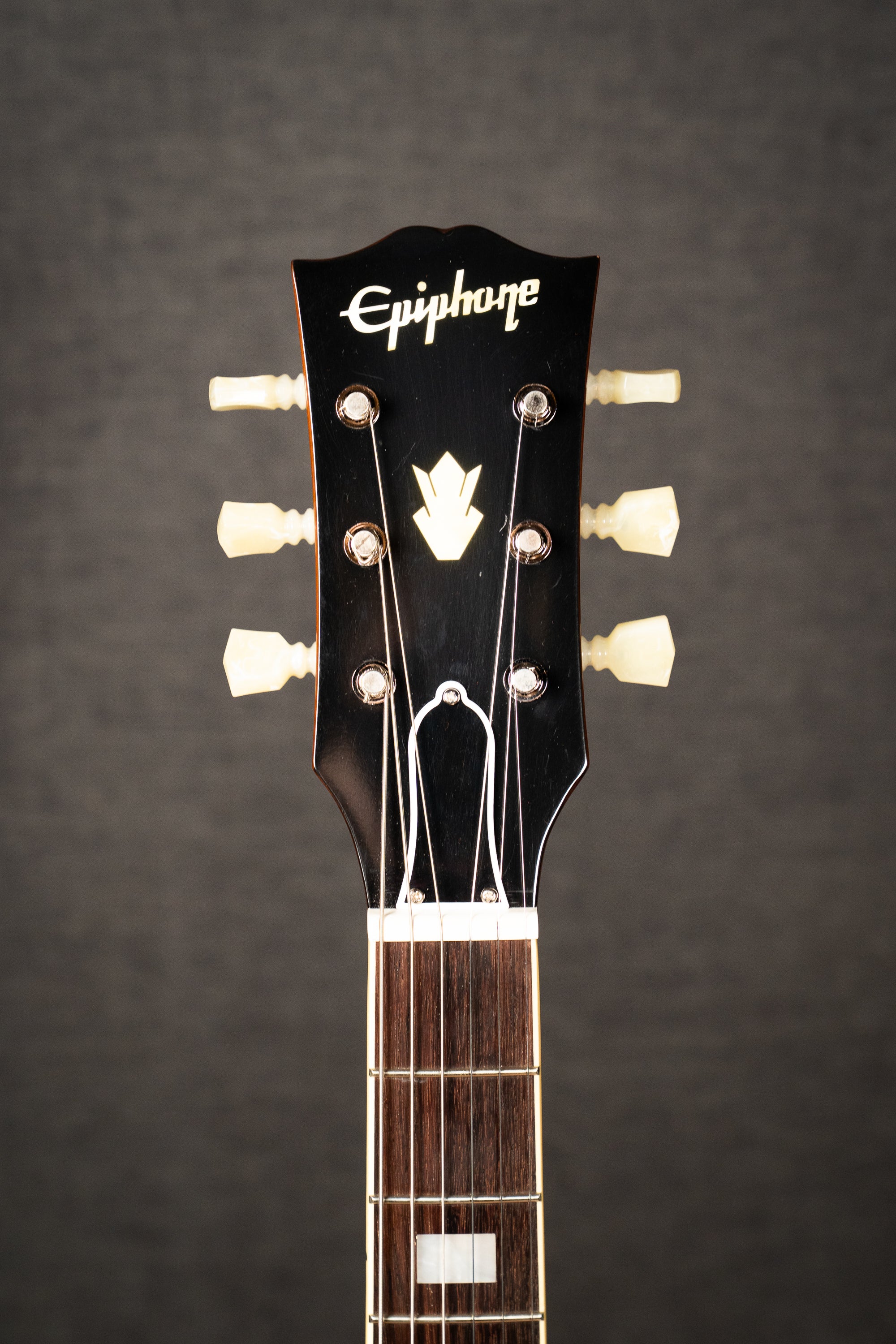 The genuine one-piece mahogany neck has a thin 1960s SlimTaper™ C profile and is capped with a rosewood fretboard that is outfitted with 22 medium jumbo frets and mother-of-pearl small block inlays. The fretboard features rounded edges to give it a comfortable, played-in feel that invites you to explore it for hours at a time. Even the side dot position markers are the same size as on vintage 1962 ES-335 models and are placed in historically accurate locations. The Gibson-style “open book” headstock features the Epiphone logo and Gibson Crown inlaid in aged mother-of-pearl and is fitted with smooth-turning Epiphone Deluxe tuning machines with Double Ring Keystone-style buttons and a Graph Tech® nut.