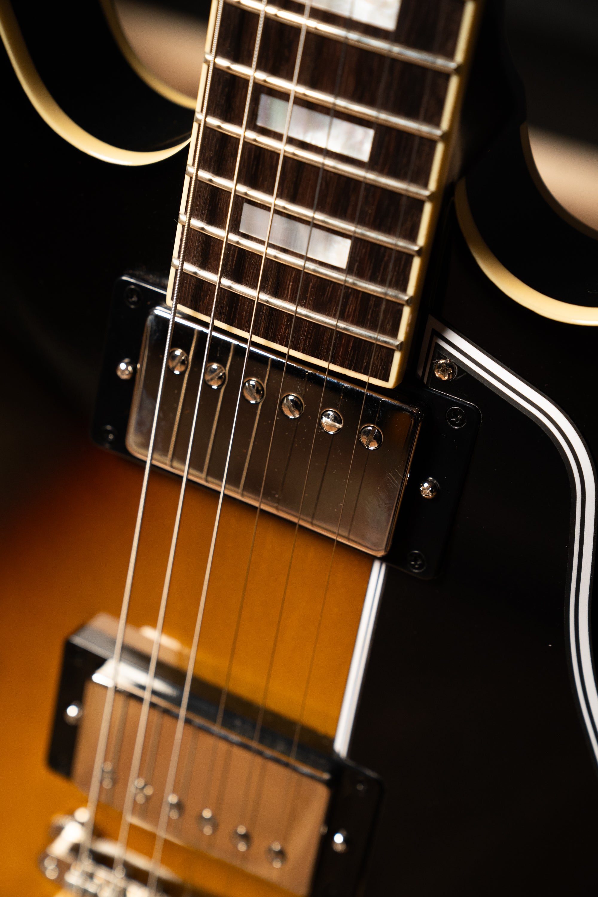 An ABR-1 Tune-O-Matic™ bridge and Gibson historic reissue aluminum Stop Bar tailpiece anchor the strings at the other end directly into the solid maple centerblock and further contribute to the 1962 ES-335’s excellent sustain. For electronics, a pair of USA-made Gibson Custombucker humbucker™ pickups are hand-wired to CTS® potentiometers and Black Beauty paper-in-oil capacitors and deliver authentic ES-335 tonal versatility, making the 1962 ES-335 Reissue a great choice for rock, blues, jazz, country, and more.
