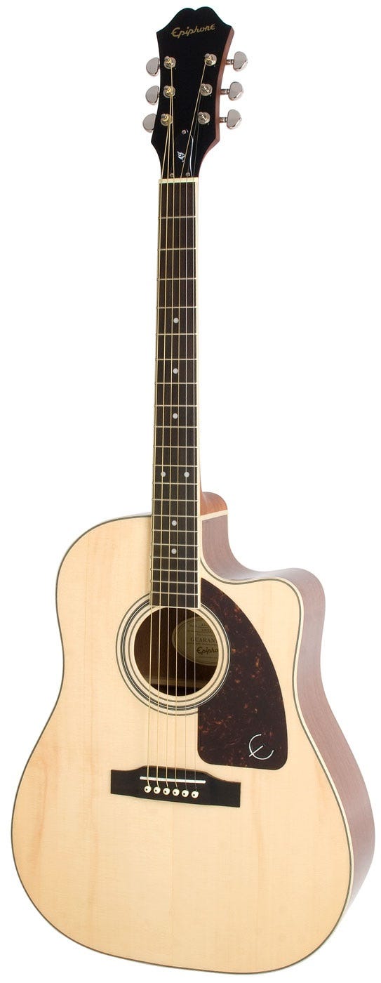 While the AJ shape plays a big role in its signature sound, the AJ-220SCE benefits from the use of premium materials and traditional construction methods. The top is made of solid Sitka Spruce that not only sounds great right out of the box but actually improves with age and lots of playing time. The back and sides are made of select mahogany. The solid mahogany neck has a 25.5” scale and is glued to the body using TiteBond™ glue and a traditional dovetail neck joint for great stability, tone, and sustain. The neck features Epiphone's classic 1960's SlimTaper™ D-profile with a smooth, fast, satin finish that’s easy to play. The bound fingerboard has a 12” radius with a 1.68” nut, 20 medium jumbo frets, and dot inlays. The classic "reverse-belly" bridge has a compensated saddle for traditional looks and accurate intonation. And last but not least, the AJ-220SCE has a tortoise-style pickguard with traditional metal "E" to protect the top against pick marks on the beautiful Natural finish.