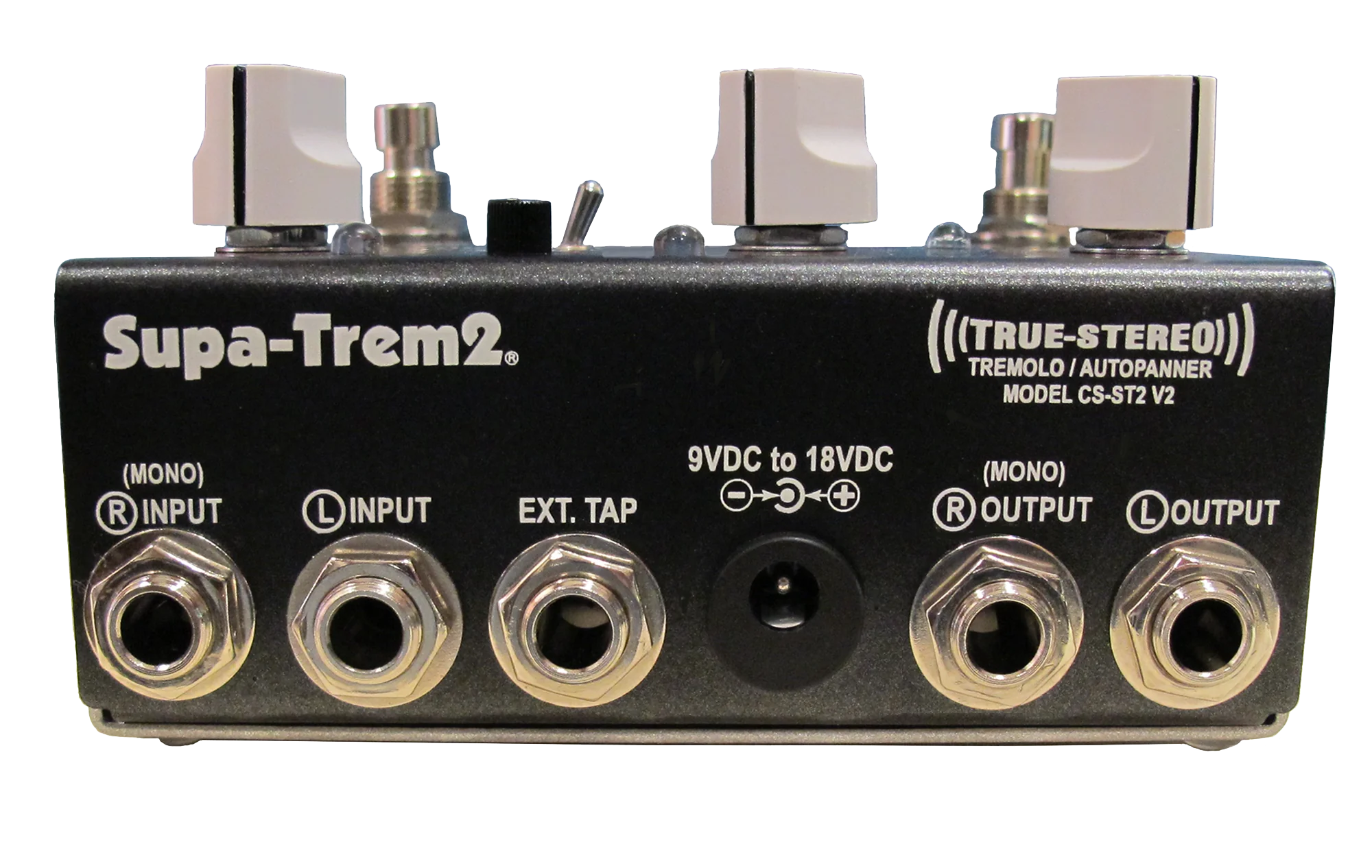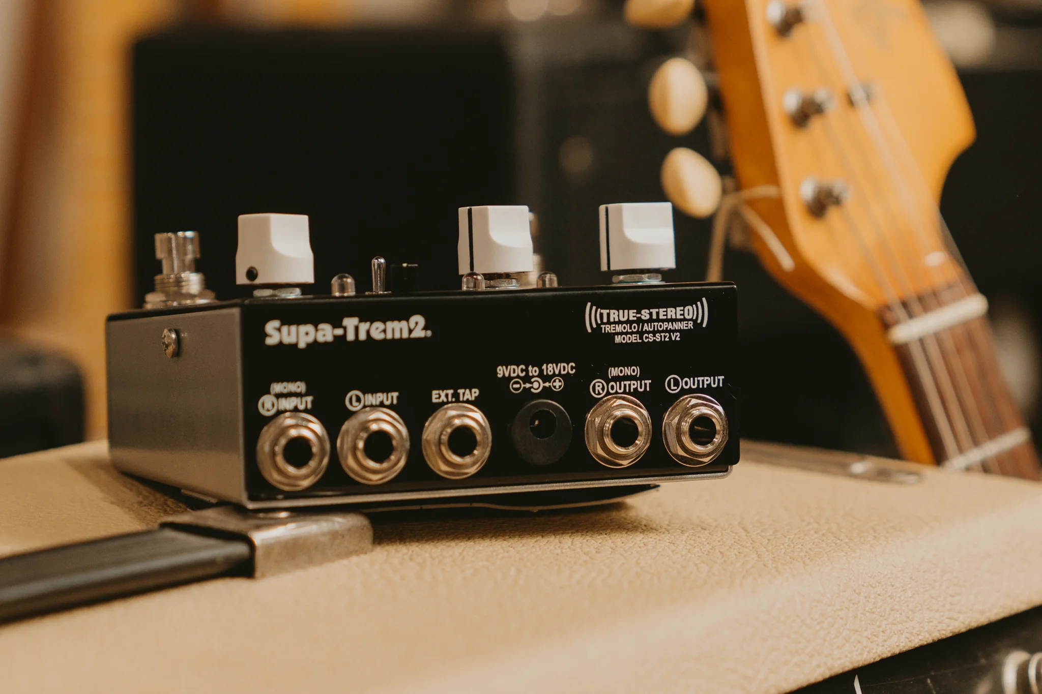 CS-ST2 v2 A while back I started wondering what would happen if I took two completely separate Supa-Trem circuits and joined them together! Not fake-stereo like other Tremolo, Chorus, Phase, or Flanger pedals, these merely invert the signal at the output and send it to another jack...boring. The CS-ST2 v2 has two identical seperate circuits in TRUE-STEREO with two INs and two OUTs! It’s got enhanced-bypass thanks to hi-quality JFET buffered outputs. The CS-ST2 v2 is the IDEAL device to place at the end of your chain...run cables as long as you want, use it as your amp splitter.