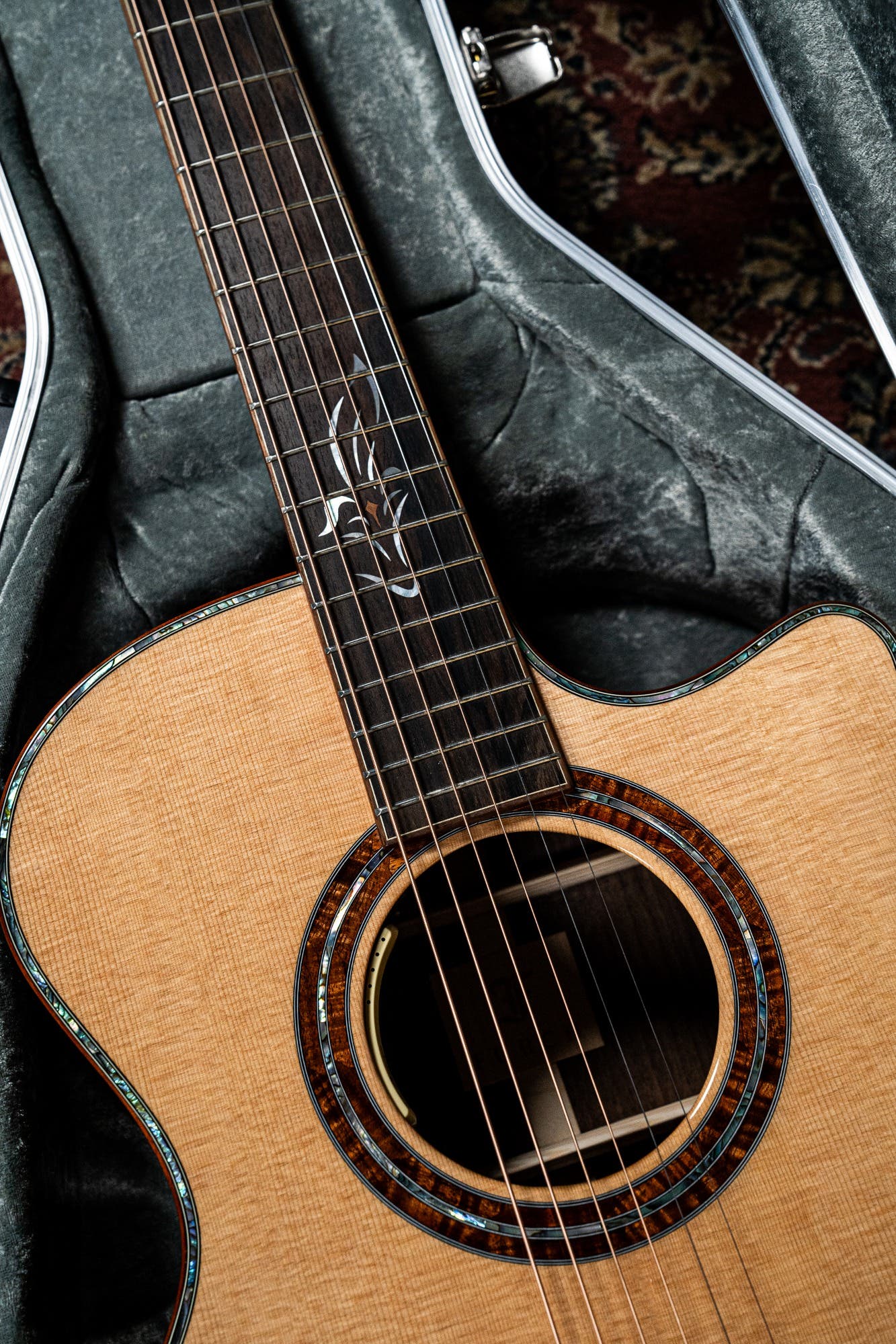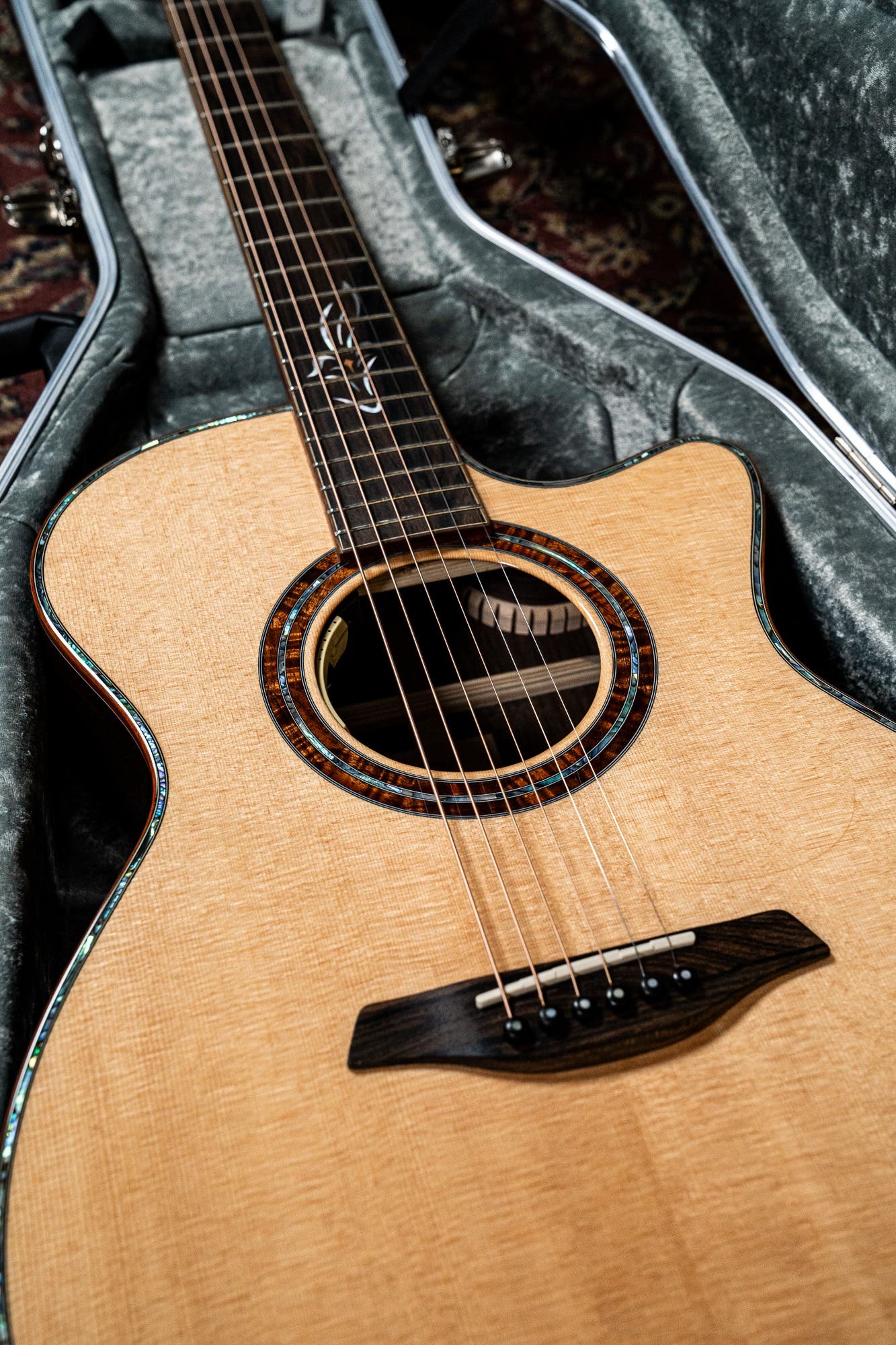 Beautiful rosette made from koa The soundhole is adorned by a rosette featuring a premium solid koa ring with green abalone inlay.