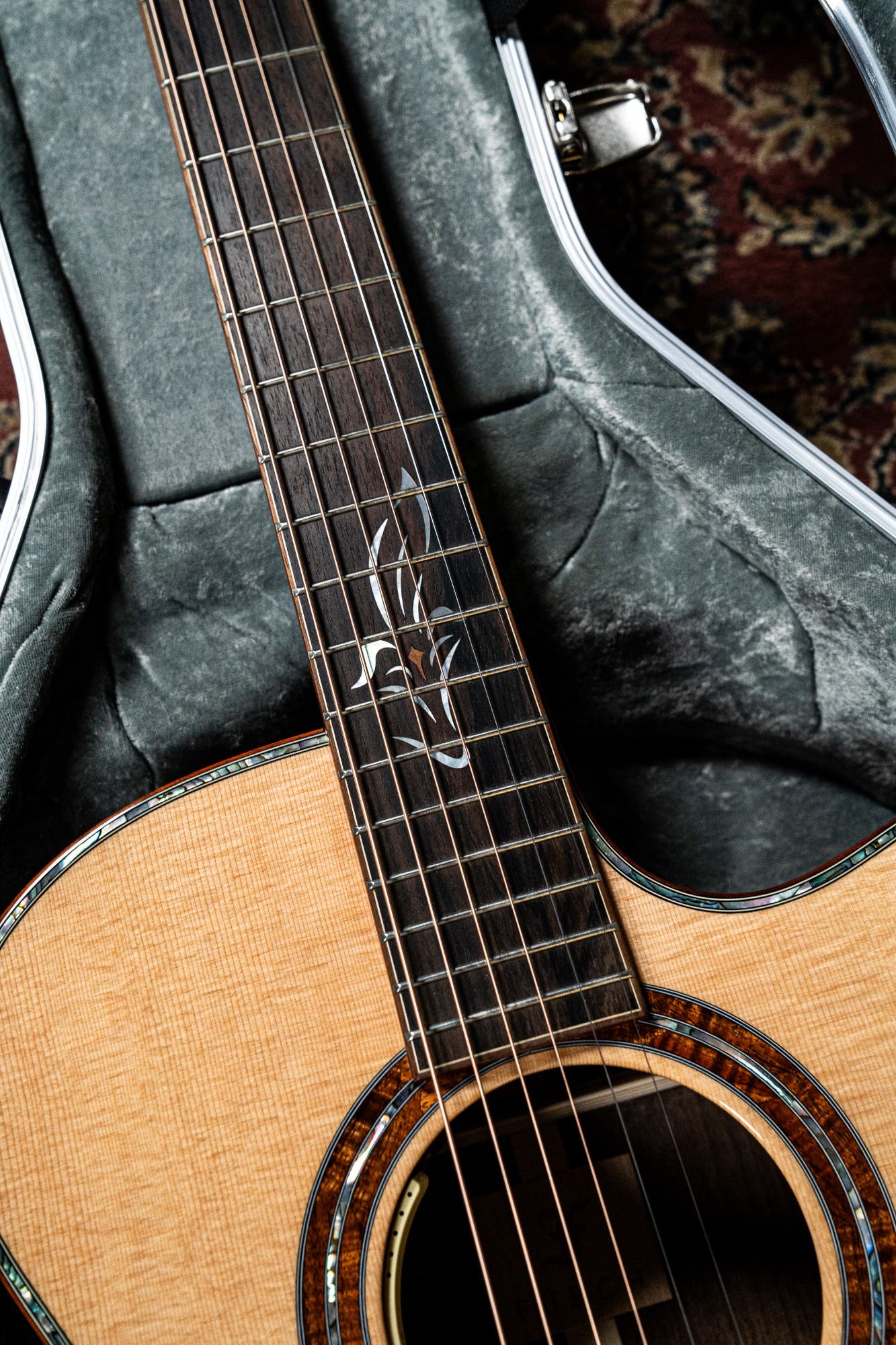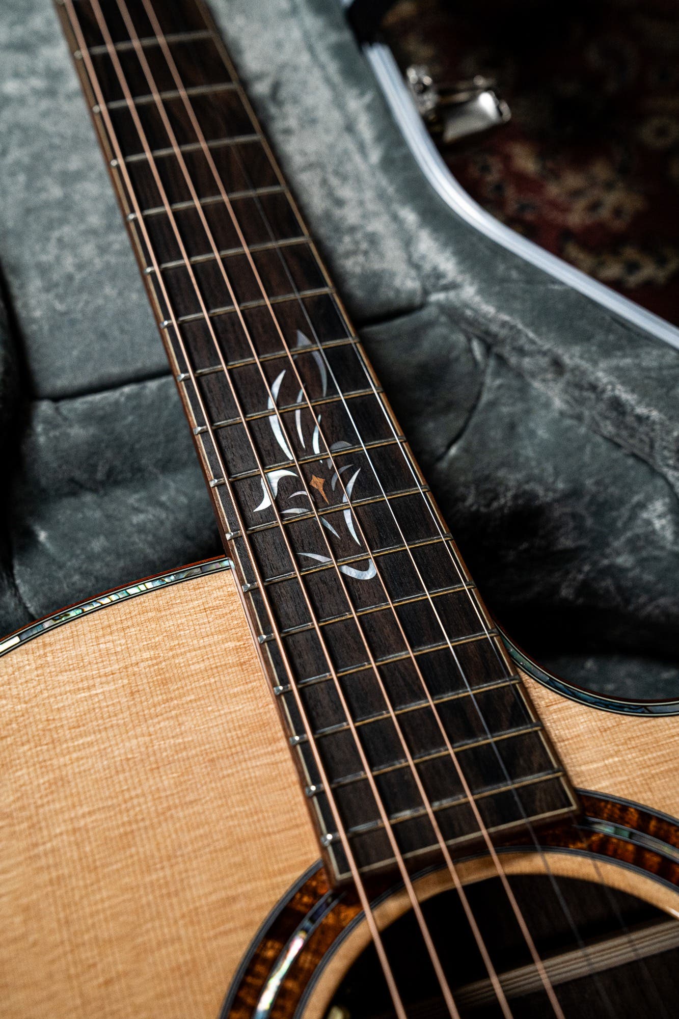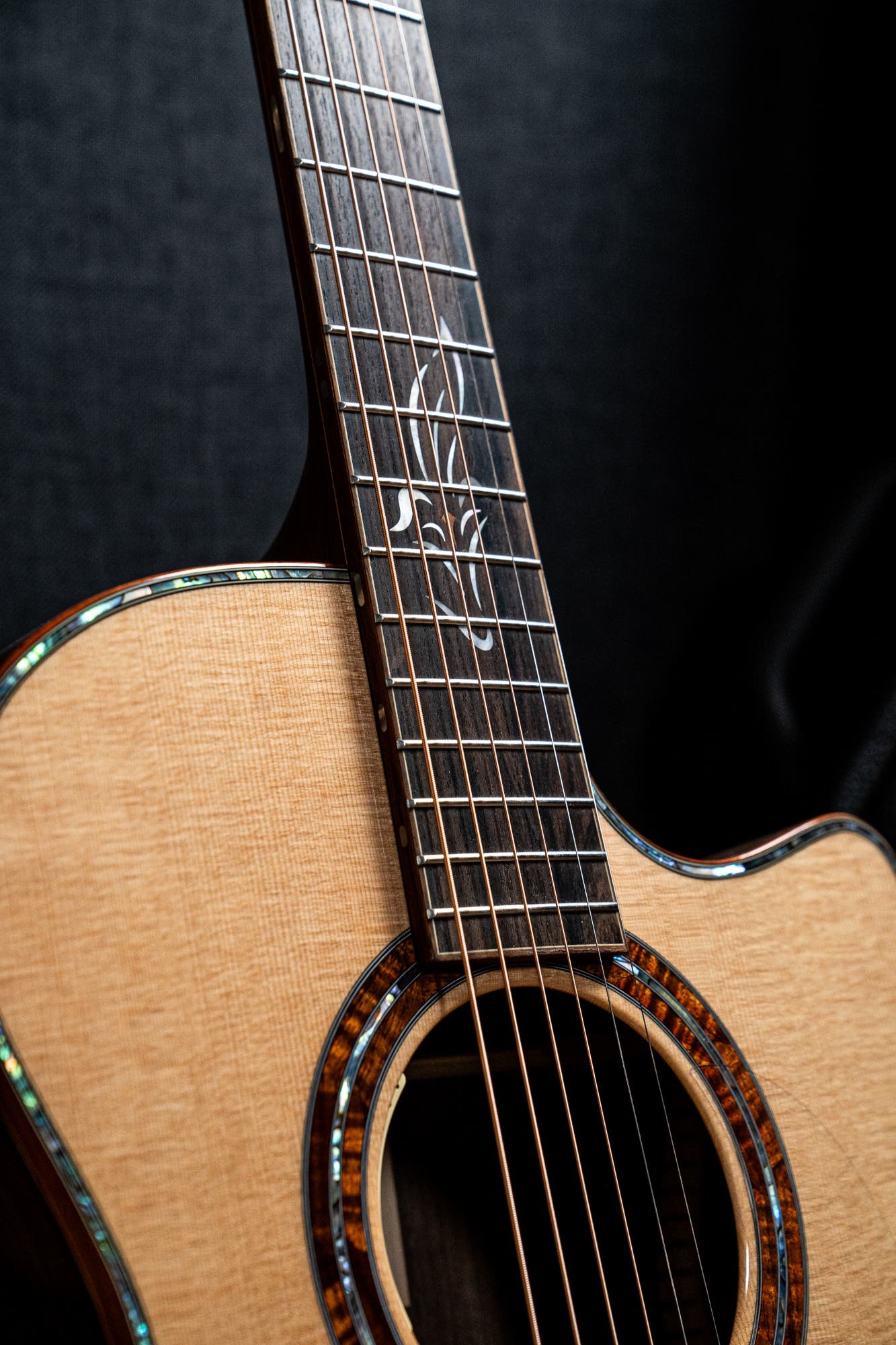 Exotic leaf inlays The fingerboard is decorated with gorgeous mother-of-pearl leaf front inlays. A similar pattern is rendered in green abalone on the headstock.