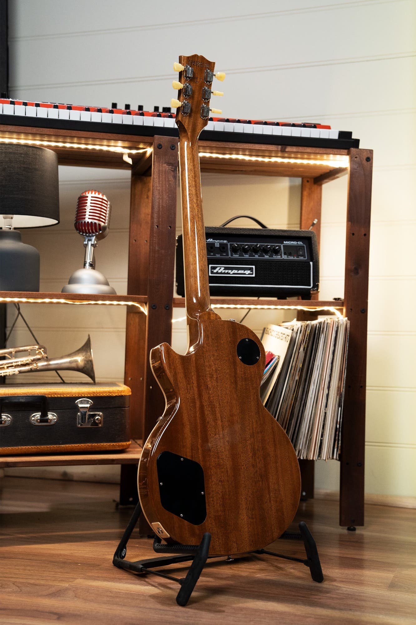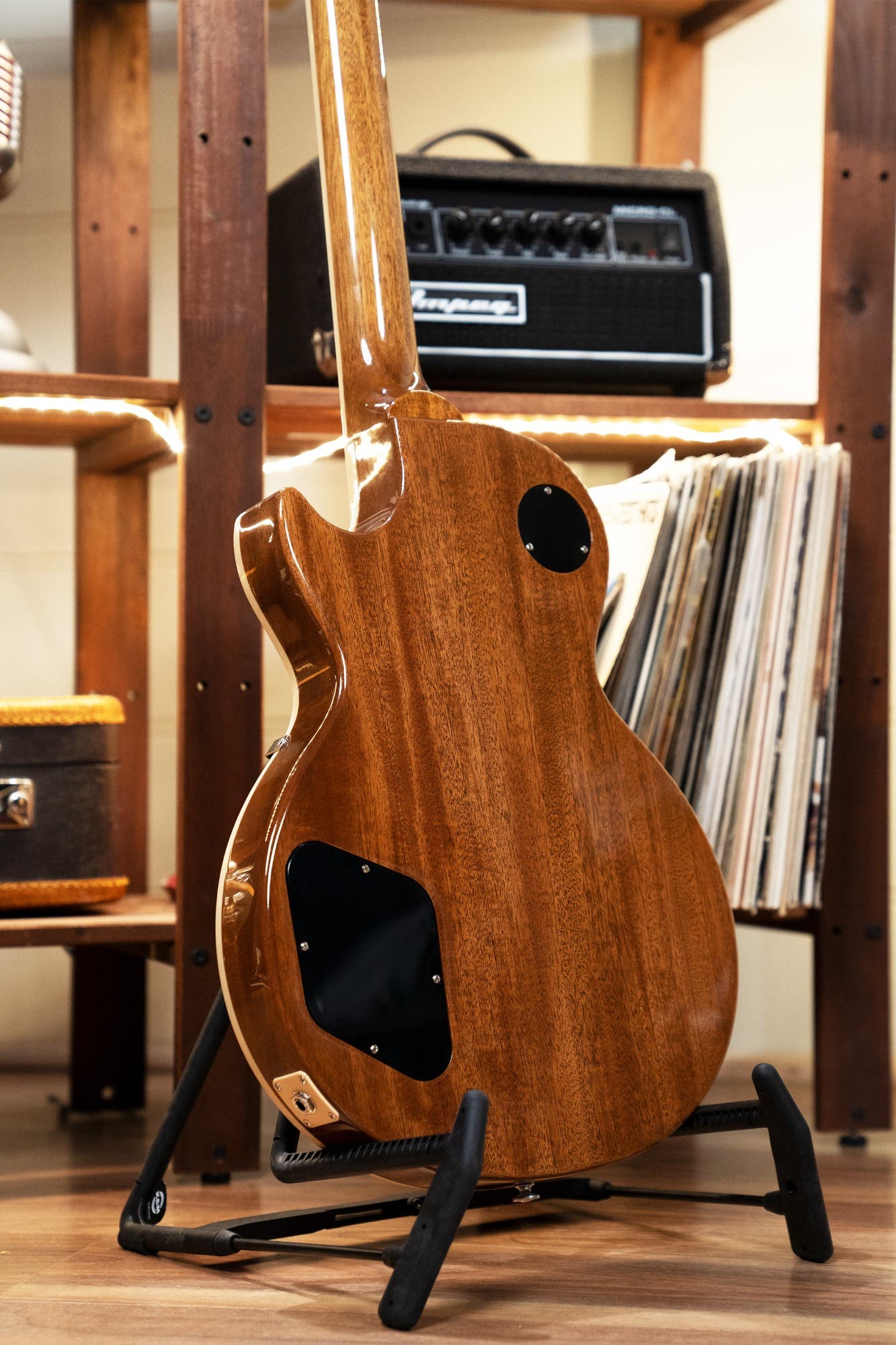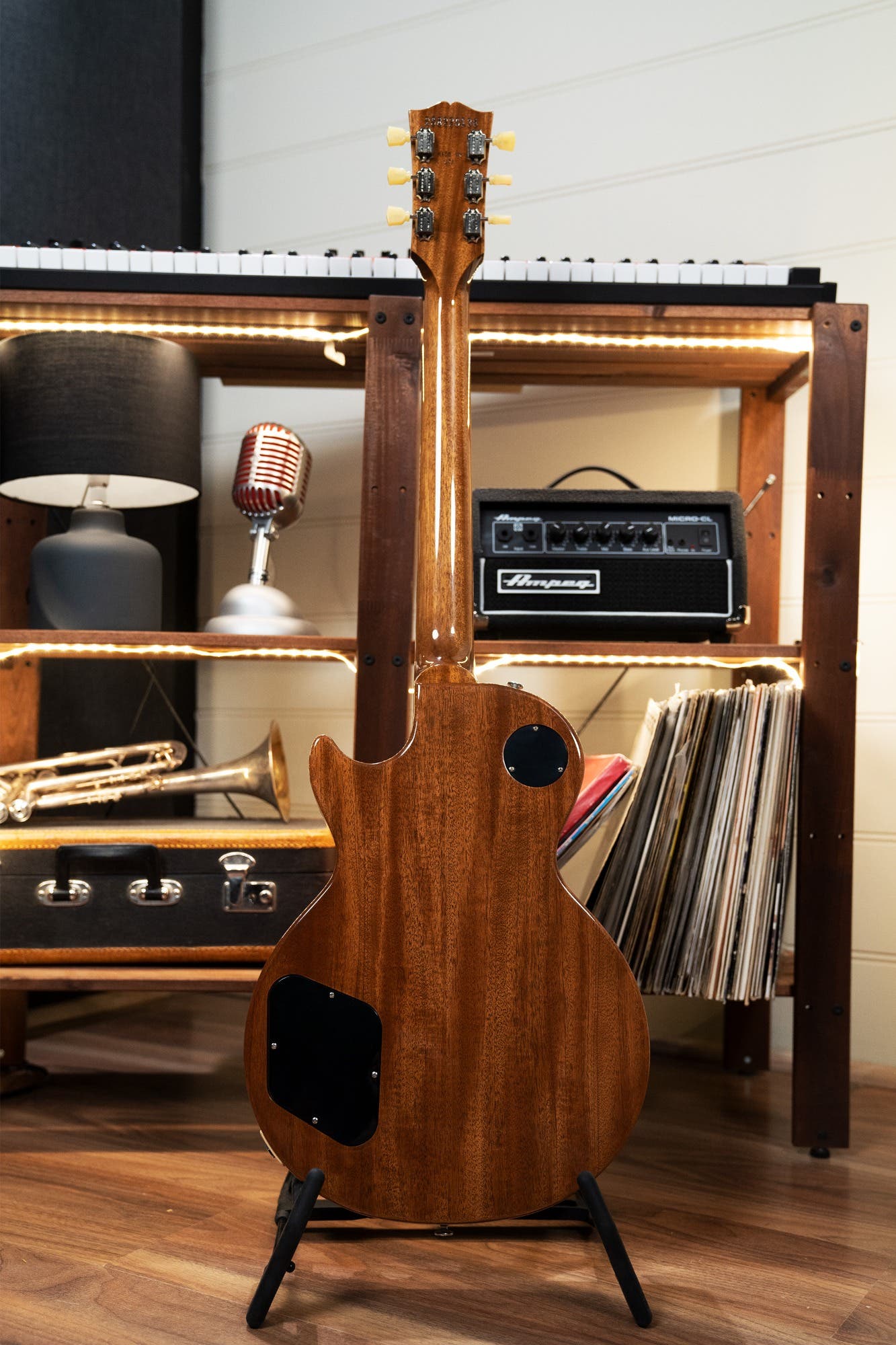 The new Les Paul Standard returns to the classic design that made it relevant, played and loved -- shaping sound across generations and genres of music. It pays tribute to Gibson's Golden Era of innovation and brings authenticity back to life. The Les Paul Standard 50's has a solid mahogany body with a maple top, a rounded 50's-style mahogany neck with a rosewood fingerboard and trapezoid inlays. It's equipped with an ABR-1, the classic-style Tune-O-Matic bridge, aluminum stop bar tailpiece, vintage deluxe tuners with keystone buttons, and amber top hat knobs. The calibrated Burstbucker 1 (neck) and Burstbucker 2 (bridge) pickups are loaded with AlNiCo II magnets, audio taper potentiometers and orange drop capacitors.