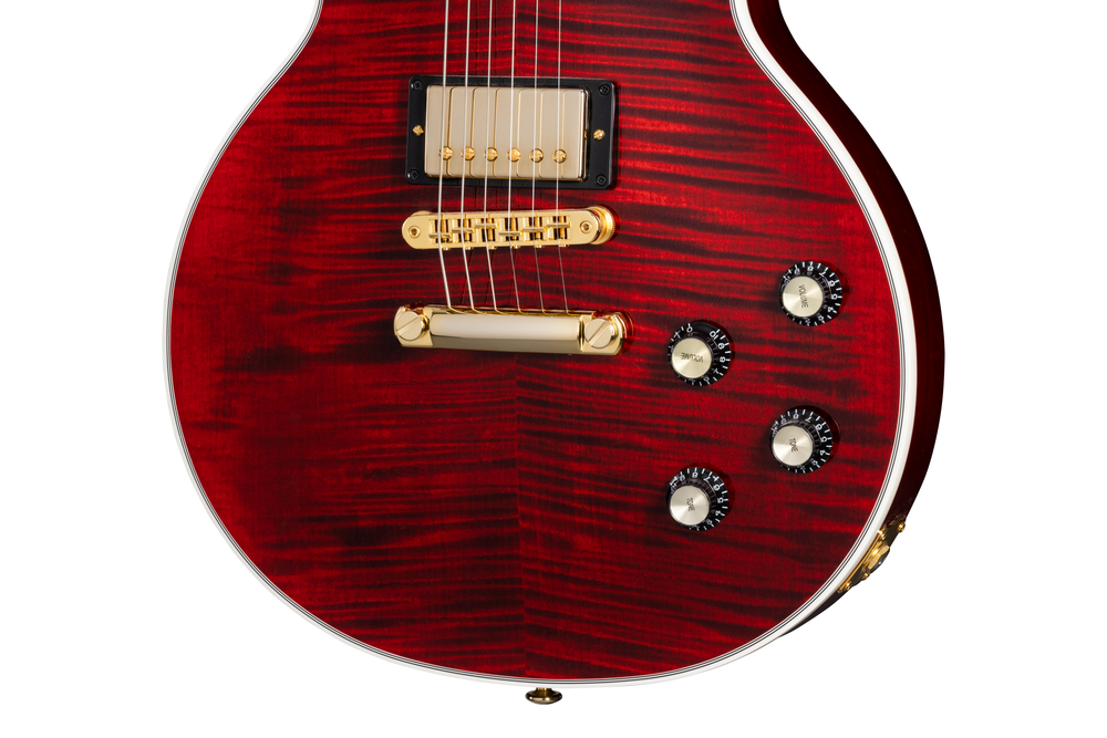 Gibson is excited to announce the return of the Les Paul Supreme. With a refreshed feature set, it is bound to overshadow everything else in sight. It features a beautiful AAA-figured maple top on a mahogany body with Ultra-Modern Weight Relief. The mahogany neck has an ebony fretboard with a compound radius and Super Split Block mother-of-pearl inlays. The neck has a Modern Contoured Heel for exceptional upper fret access, and the headstock is adorned with a striking new mother-of-pearl inlay inspired by a design from the 1940s that was discovered in the Gibson archives. The Burstbucker Pro and Burstbucker Pro + pickups are paired with push/pull Volume and Tone potentiometers for flexible coil tap, phase, and Pure Bypass switching. The three gorgeous finishes are elegantly highlighted with gold hardware, making this not only a great-sounding and highly flexible instrument but also an exceptionally beautiful-looking modern rock machine. A hard-shell case is also included