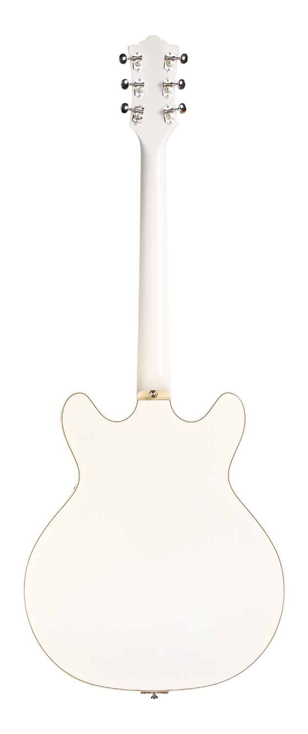 Semi-hollow body. A deluxe double cutaway loaded with features that give a fully expressive voice to your individual playing style. The classic Guild Starfire V is a semi-hollow beauty with a graceful 16 3/8" thinline body and twin Guild LB-1 "Little Bucker" pickups that make it an outstanding choice with an authentic Guild voice perfect for rock, blues, roots and more. The Starfire V's all-mahogany body features an arched top and back, with dual f holes, elegant ivory white body binding, black/white purfling and center-block construction. Other premium features include bound three-piece mahogany/maple/mahogany neck with vintage-style "soft U" profile, 22-fret rosewood fingerboard with 9 1/2" radius and pearloid block inlays, three-way pickup selector switch, individual volume and tone controls for each pickup and master volume, Tune-O-Matic bridge with rosewood base, Guild vibrato tailpiece, Grover Sta-Tite tuning machines, nickel hardware and a gorgeous White finish. Includes plush-lined hardshell case.