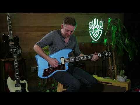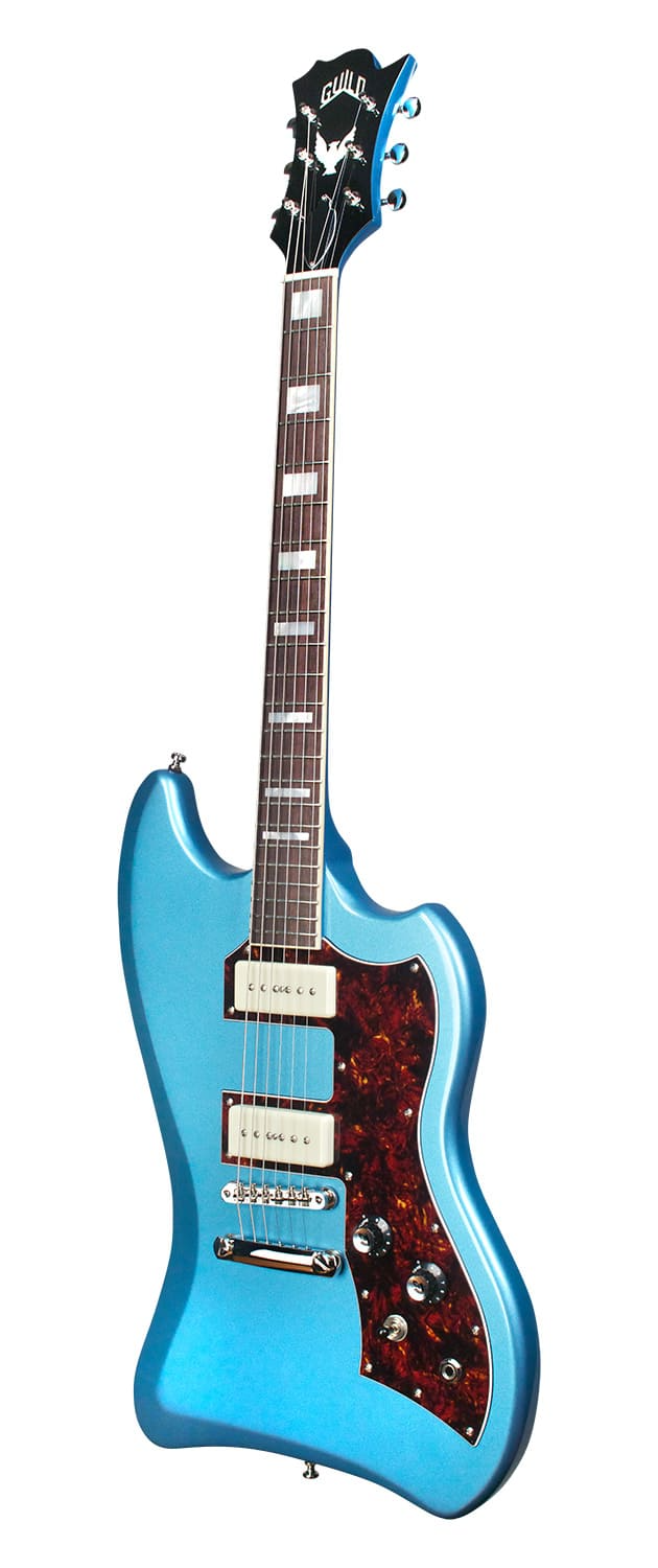 Body: Body Type Solid Body Body Top Mahogany Body Shape T-Bird Finish Gloss Polyurethane, Pelham Blue Body Depth Upper Bout 1 1/2″ (38 mm) Body Depth Lower Bout 1 1/2″ (38 mm) Body Width Lower Bout 12 3/4″ Body Width Upper Bout 11 3/4″ Overall Guitar Length 40″ (1016mm) Neck: Neck Material 1-Piece Mahogany Neck Shape C Neck Finish Gloss Polyurethane Scale Length 24 3/4″ (628 mm) Nut Width 1 11/16″ (43 mm) Nut Material Bone Neck Binding Cream Fingerboard Material Rosewood Fingerboard Radius 10″ Fingerboard Inlays Pearloid Block # of Frets 22 Fret Nickel/Silver Medium Tuning Machines Grover® Sta-Tite™ Open-Gear 18:1 Hardware Finish/Plating Nickel Plated Truss Rod Dual-Action Truss Rod Wrench 7mm Nut Driver Features: Bridge Guild® Tune-O-Matic Strings Nickel Wound Regular Light .010-.046″ Bridge Pickup Franz P-90 Neck Pickup Franz P90 Controls Master Volume and Tone, Toggle Switch Strap Buttons Nickel Plated Pickguard Tortoisehell