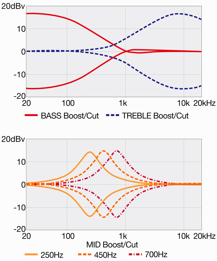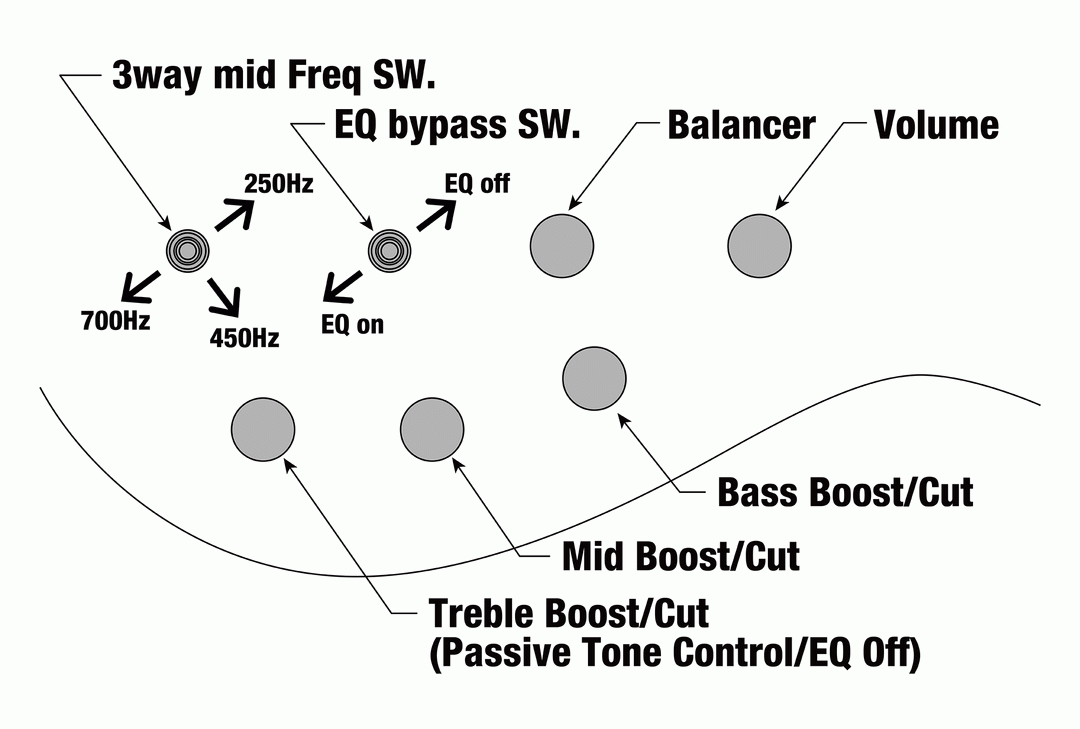 - 3-way Mid frequency switchThe 3-way Mid frequency switch allow players to change the mid-tone between 250, 450, and 700 Hz.
