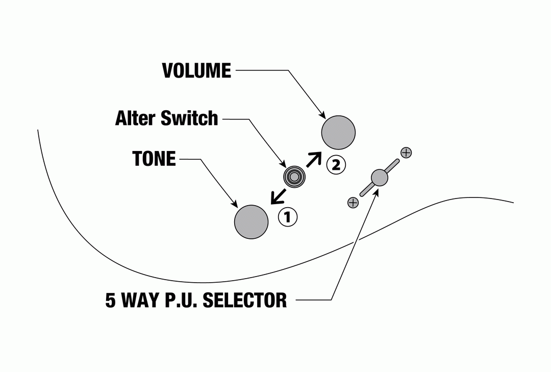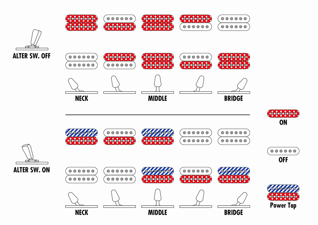 - dyna-MIX10 switching system with Alter SwitchThe dyna-MIX 10 offers ten sound variations and can easily switch from humbucker and single coil modes with the mini switch. The power Tap mode provides a realistic single coil sound despite its two humbucker pickup layout.
