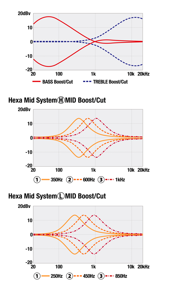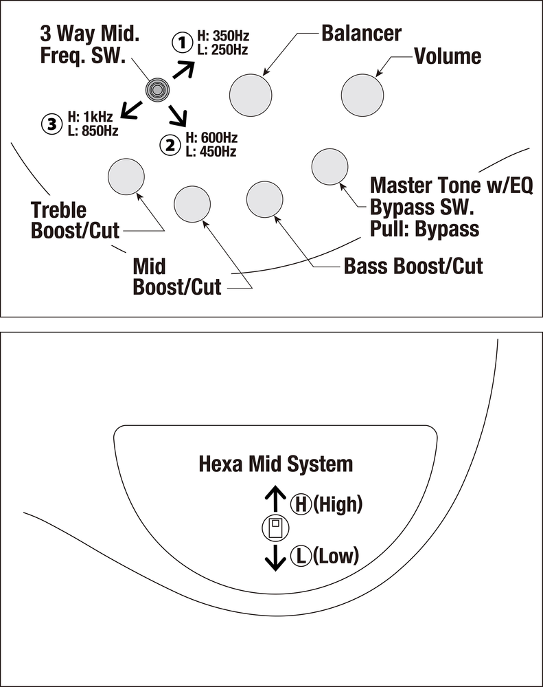 - 3-way Mid frequency switch w/Hexa Mid system The Hexa Mid system offers players the flexibility to choose from two mid-range banks, each containing three distinct frequency points, for a total of six. Its exceptional versatility and user-friendly interface help players achieve their ideal bass sound.