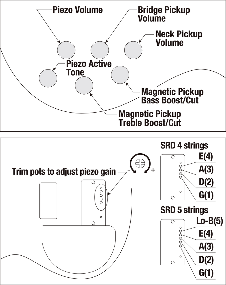 - Ibanez 2-band EQ w/Piezo active tone control The EQ section incorporates the controls of the magnetic pickup(s) with the AeroSilk Piezo system. Controls include a Master volume, bass and treble controls for the pickup(s) and a Master volume and a tone control for the Piezo system.