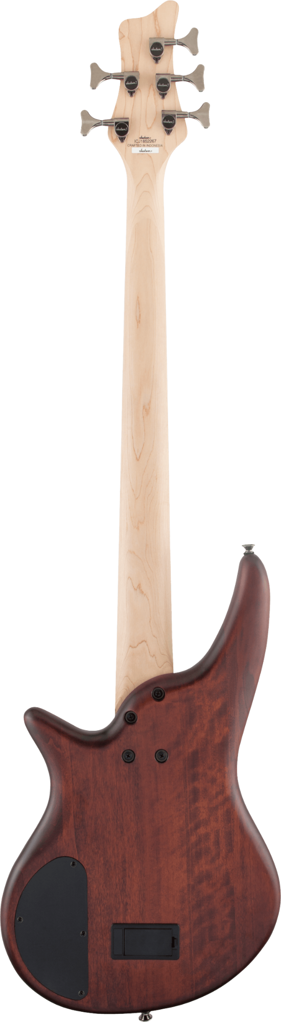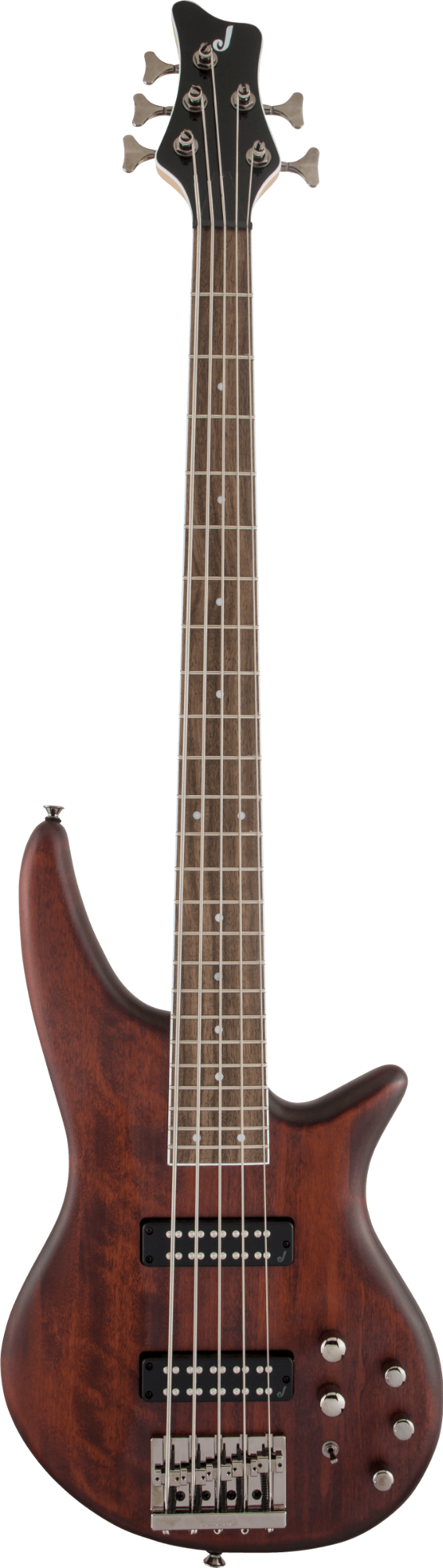 Features 35"-scale, 5-string bass Poplar body Bolt-on maple neck with scarf joint 12"-16" compound radius bound laurel fingerboard with 24 jumbo frets and white dot inlays Passive Jackson medium-output humbucking bridge and neck pickups Two-way toggle switch with pickup coil split, blend control, 3-band EQ (active only) and volume control (with push/pull selector to bypass active circuit) Jackson HiMass™ bridge Jackson sealed die-cast tuners Unique Jackson 3x2 black headstock