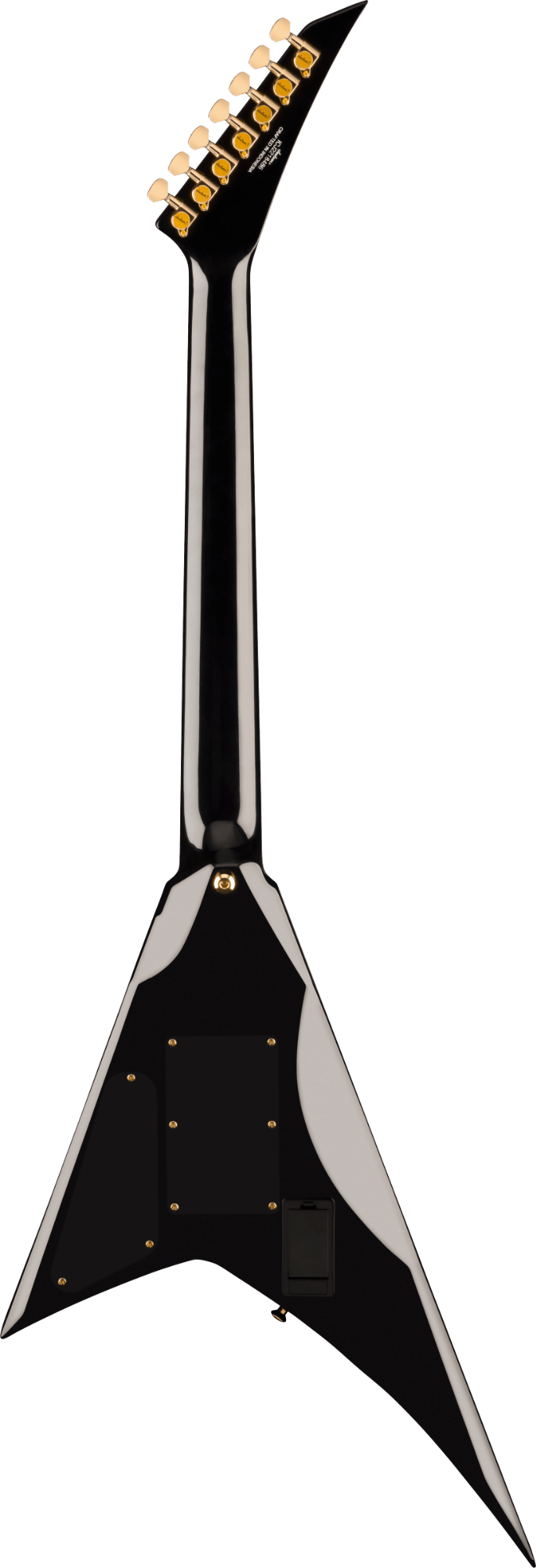 The Jackson Pro Signature Mark Heylmun RR24-7 makes a bold statement onstage in a Gloss Black finish with white pin stripes, reverse Jackson pointed 7-in-line black headstock and gold hardware.