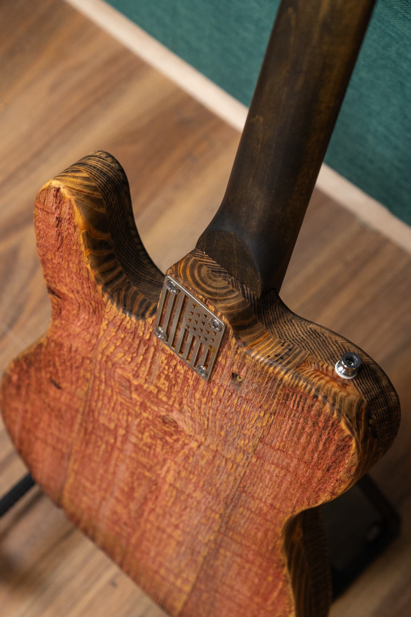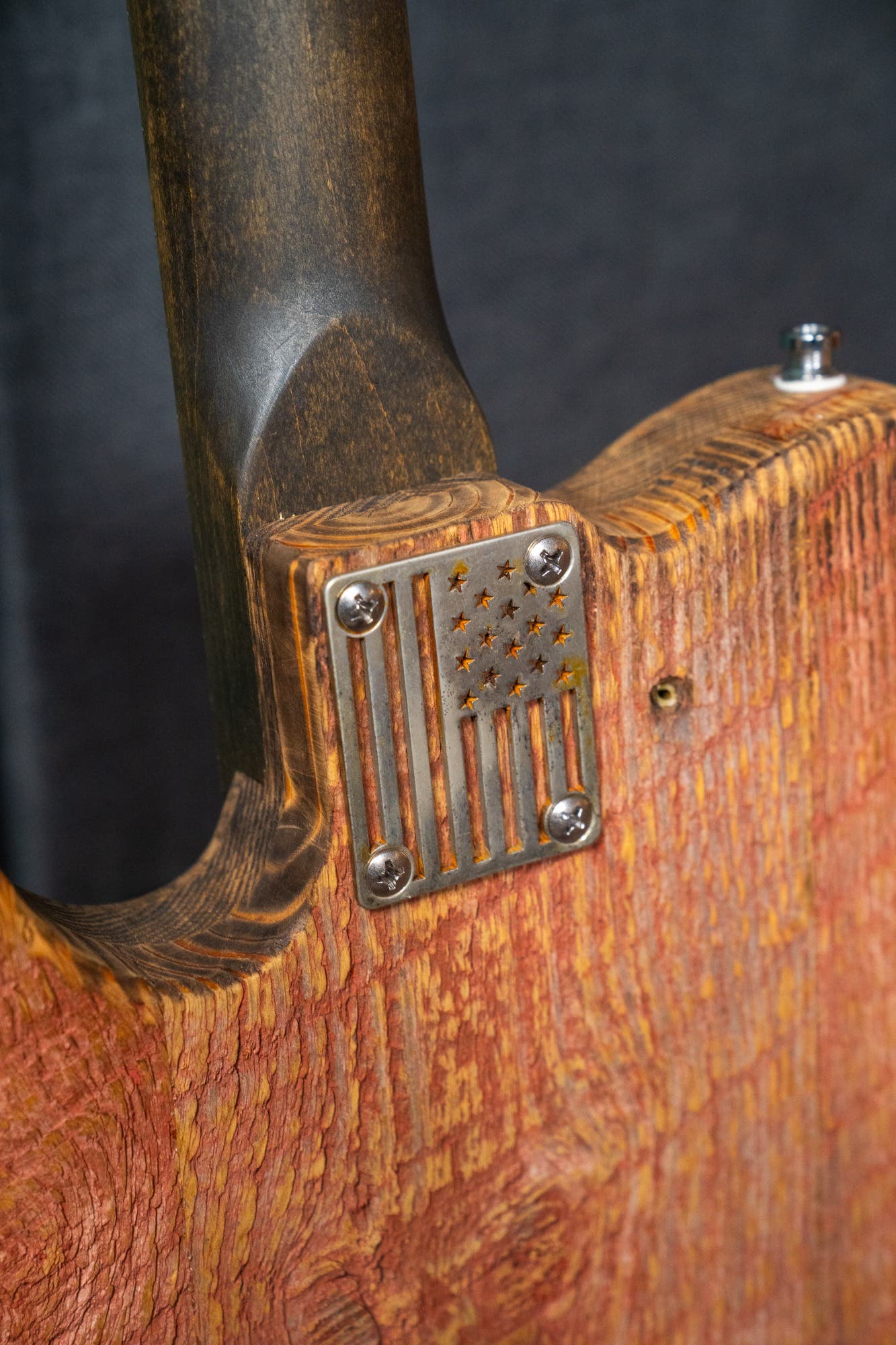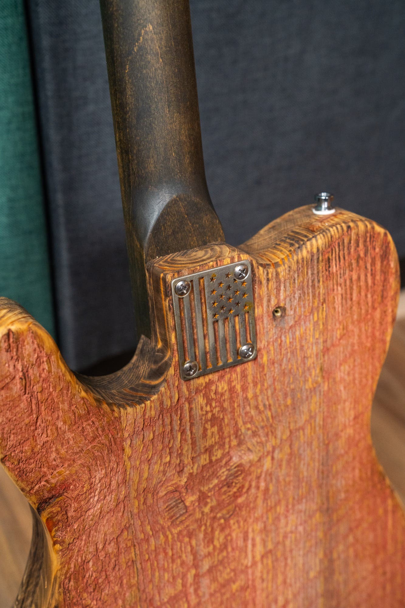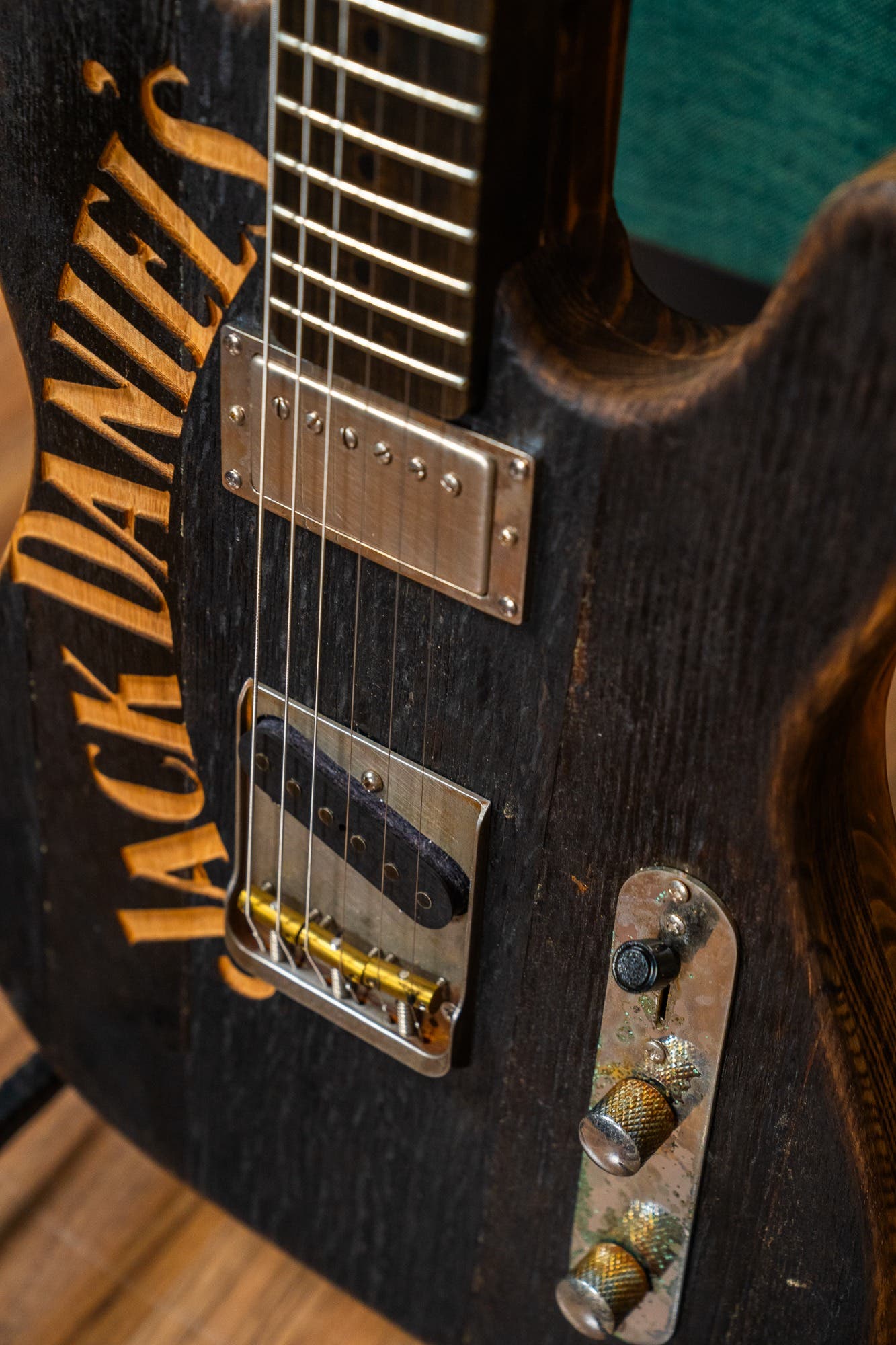 The barrels come in all shapes and sizes, I get them to look the best I can for what Jack Daniels ships to me. Shipping with an aged oak neck and a nice u-ish shaped carve, jumbo frets, white clay dot markers. 1 5/8 Nut, with a 9.5 Vintage radius, locking tuners and locking straps.