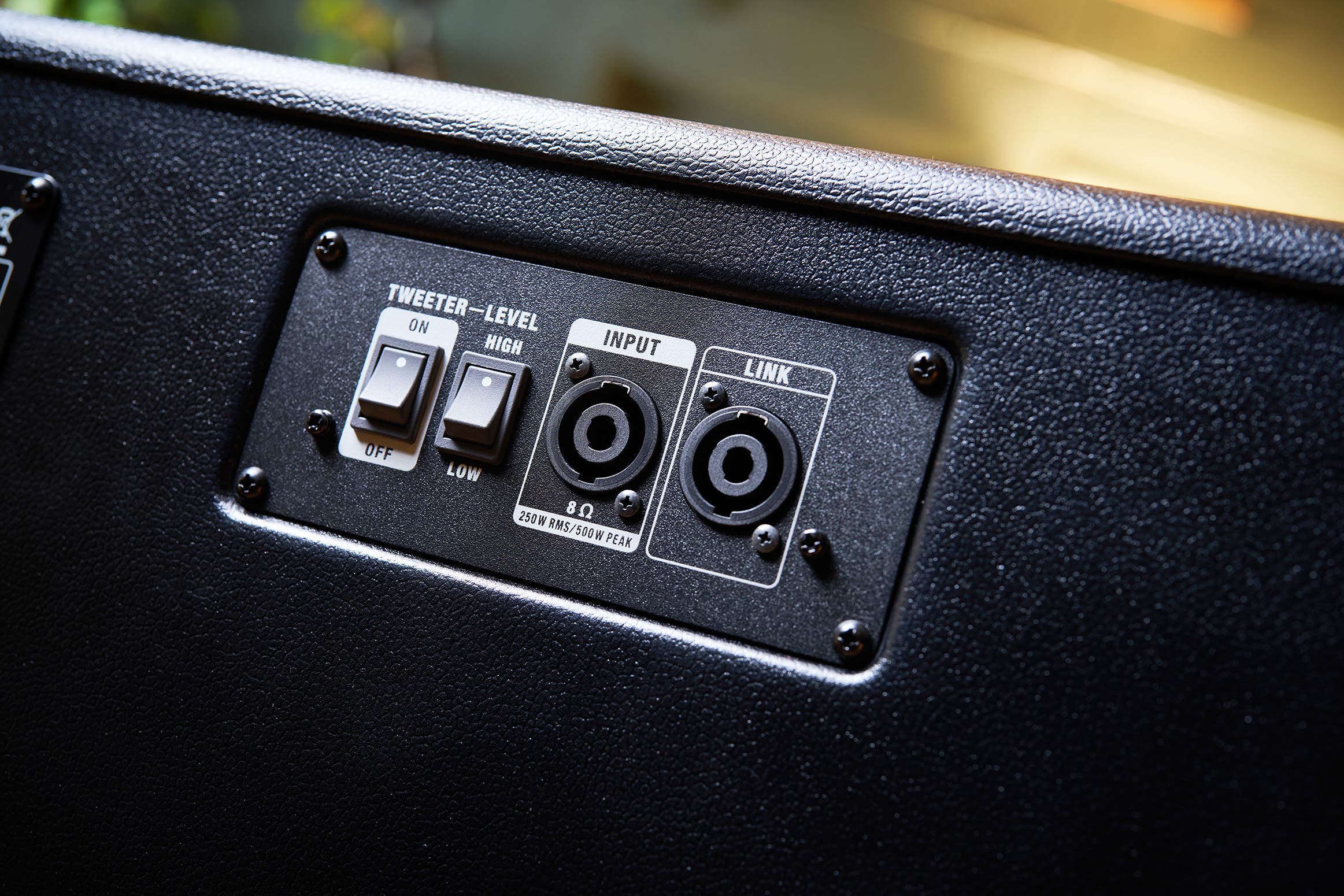 The Katana-500 Bass Head is equipped with dual speaker outputs, letting you stack two Katana Cabinet 112 Bass units for a bigger sound on larger stages. Locking-style jacks provide secure connections and support for high-current operation. The Katana Cabinet 112 Bass also features a link jack for connecting a second cab when using an amp with just one speaker output.