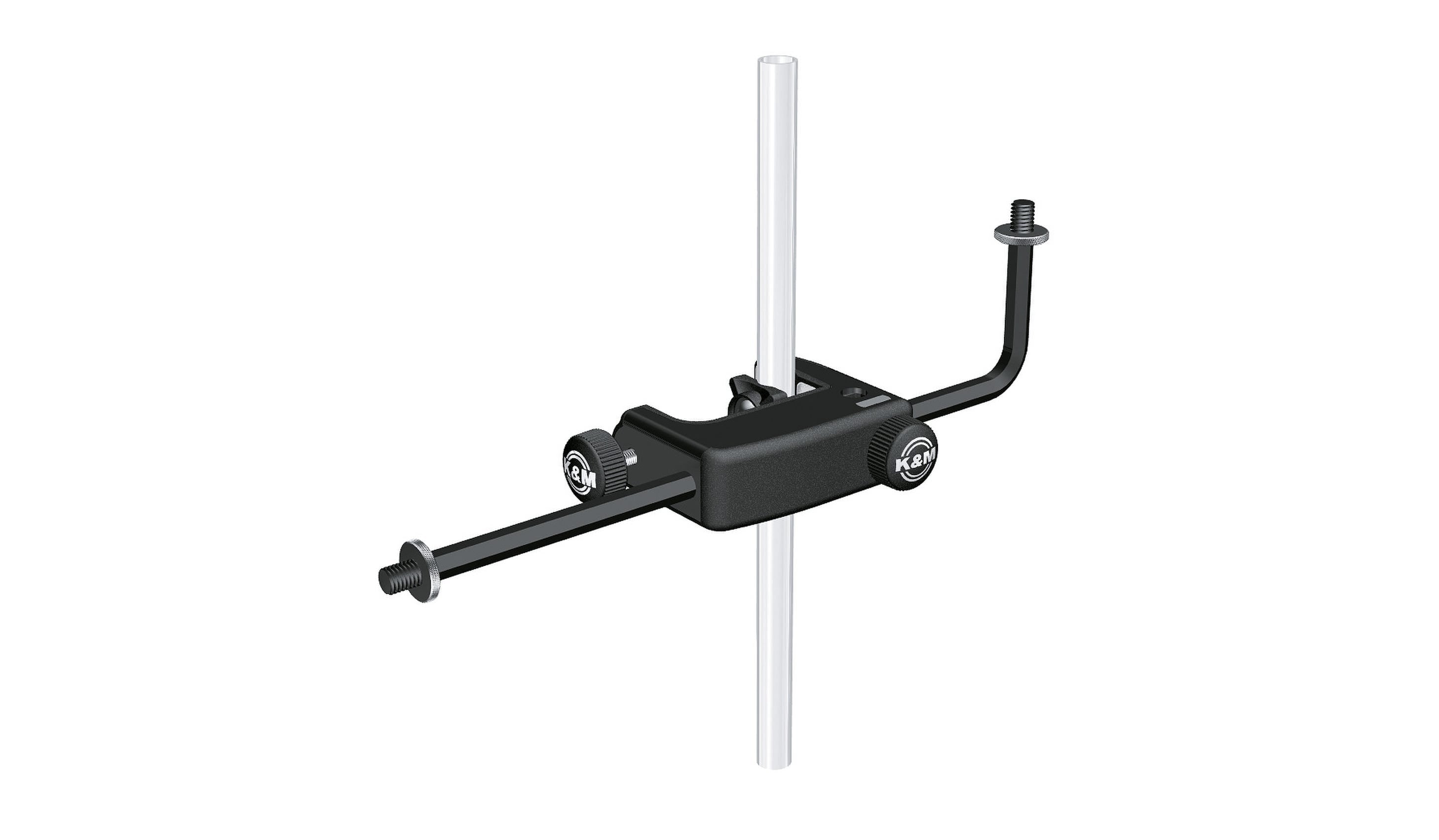 Universal microphone holder suitable for many applications. The microphone can be mounted vertically or at an angle of 90°. In addition the hexagonal rod can also be attached horizontally or vertically to the table clamp. The clamping width of 0 to 48 mm allows the clamp to be attached to a wide variety of surfaces. Its stable metal construction with high quality plastic inserts guarantees secure and strong hold. The cleverly shaped clamping parts allow the clamp to be used on smooth surfaces and round-shaped tubes.