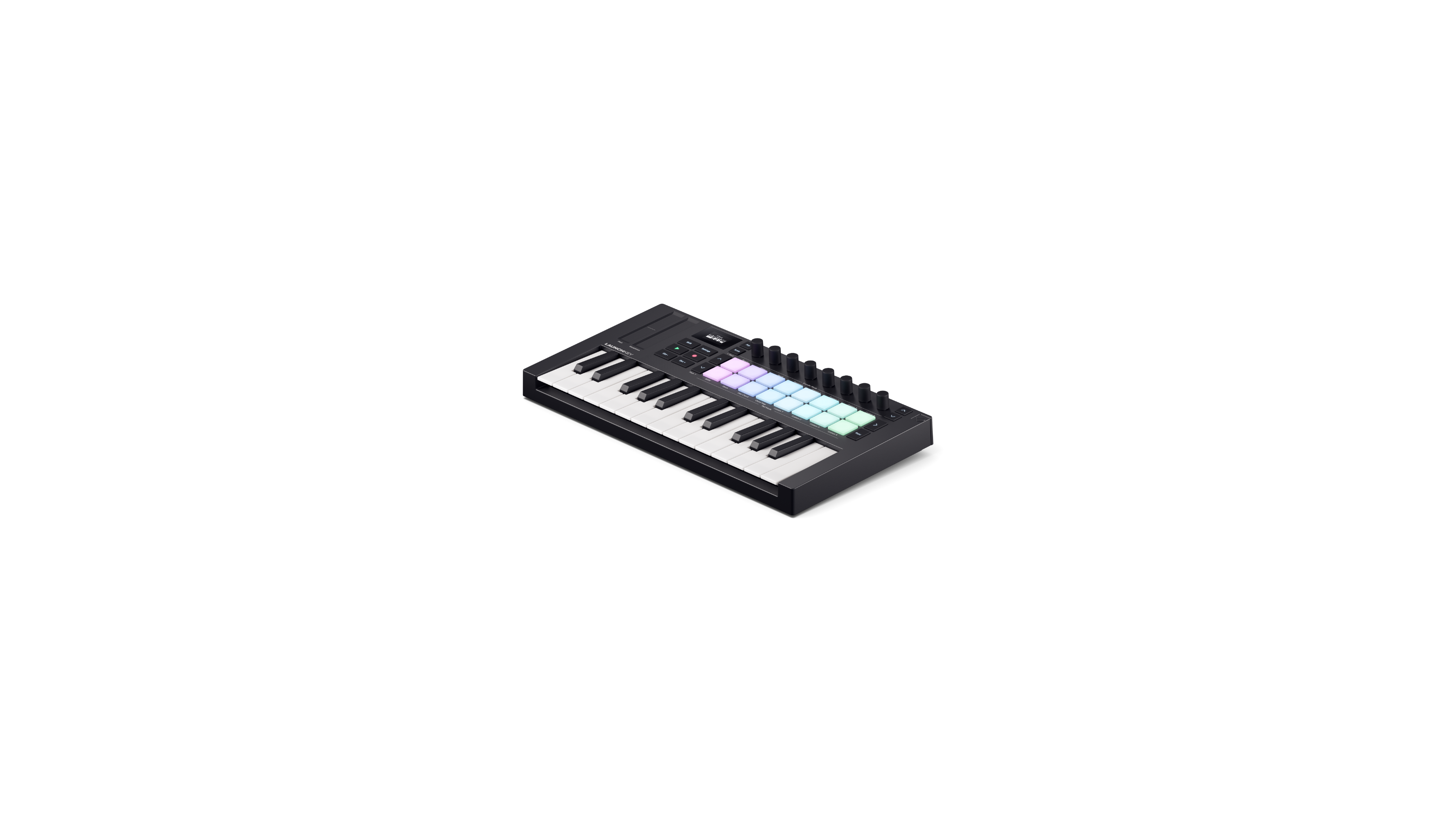 Find inspiration anywhere with Launchkey Mini 25 – a portable, all-in-one DAW controller with two octaves of synth-action minikeys and 16 patented FSR pads for finger drumming, clip launching, and more. The next generation of Launchkey also gives you new ways to get creative in your DAW, with hardware synths, or on iPhone and iPad. Chord, Scale, and Arpeggio Modes have each been expanded to help you stay in key and perform in even more expressive ways – all with detailed feedback from the crisp, new OLED display.
