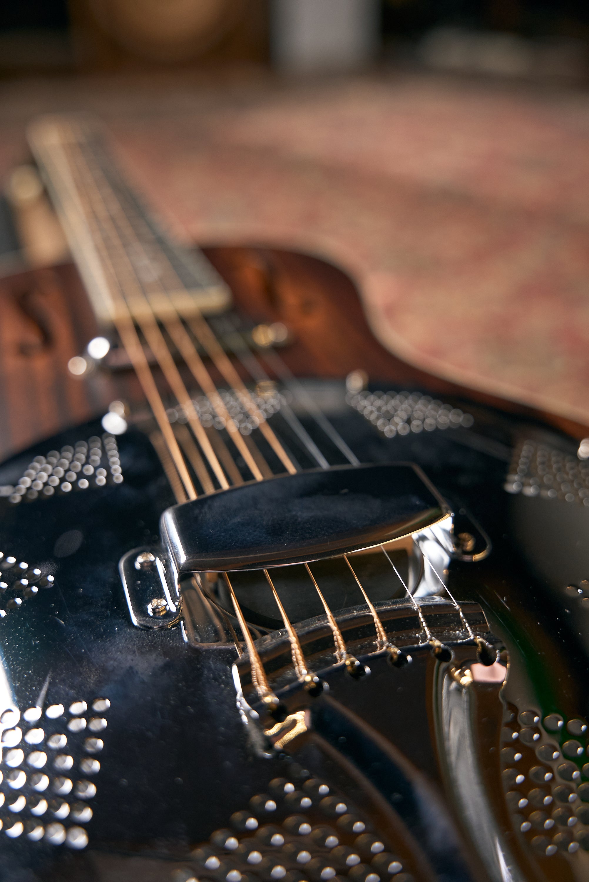 A distinctive cone resonator that is integrated into the resonator guitars gives the characteristic overtone-rich twang.