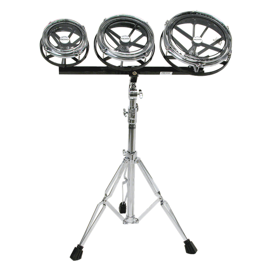 The Rototom® Set is constructed with a rapid-tuning system, allowing for instant tuning in a range of more than one octave. The Rototom® Set does not have a traditional drum shell. Instead, the drumhead and counterhoop are mounted on an aluminum frame (spoke) through which the tension rods are attached to a bottom frame which is mounted on a threaded center bolt. Rotating the frame raises or lowers the tension, thus raising or lowering the pitch of the drum. Their Versa®tility has led to the widespread use of Rototom®s in live situations, recording studios, percussion ensembles and symphonic Concert music. Rototom® Sets feature two or three Rototom®s mounted on a single stand for Versa®tility and convenience.