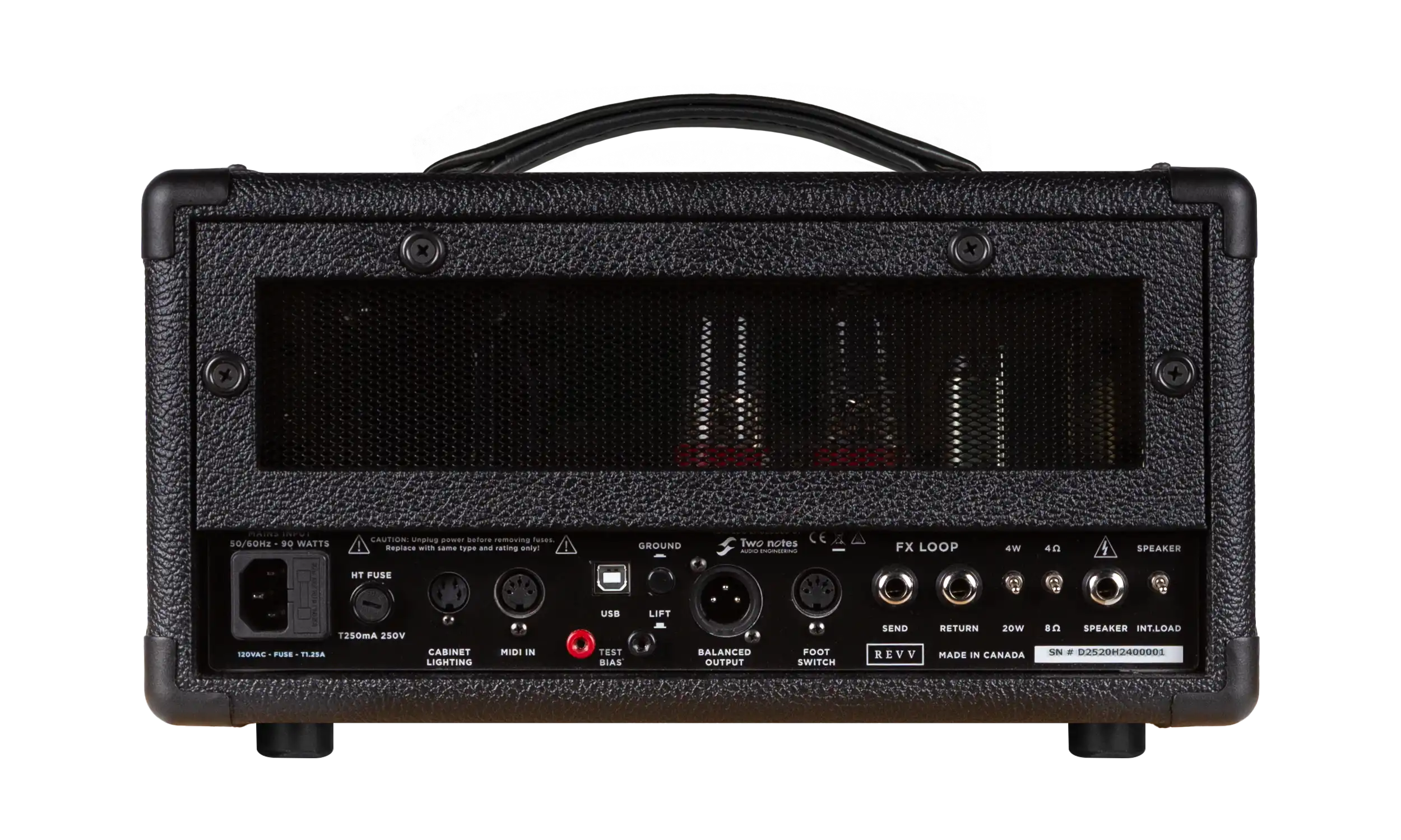 • The award-winning D20 platform updated for 2025 w/ new switching options, onboard reverb, & tonal tweaks. • All-tube design w/ 2x 12AX7 preamp + 2x 6V6 power tubes. Switchable from 20w to 4w operation. • Gain, Treble, Middle, Bass, Volume, Reverb, & Level controls. Bright & Gain Boost switches. • Perfect for clean & edge of breakup tones w/ an organic, touch-sensitive feel ideal for pedals. • Pristine digital reverb, transparent buffered effects loop, control via MIDI or the included footswitch. • Two notes Torpedo-embedded reactive load & impulse response XLR out for direct performance & recording. • 6 virtual cabinet presets via rotary switch or 128 via midi. Power amp simulation, EQ, & more available via USB editing w/ Two notes software. • Use cabinet & XLR outputs simultaneously or one at a time. (e.g. only XLR for silent stages, both when you also want stage volume) • Simple bias testing & easy fuse access. Switchable 4Ω/8Ω speaker jack. Internal load automatically activates to protect amp. • New standard compact tolex headshell. Choose your colors in our custom shop! • Manufactured in Canada to rigorous quality standards w/ 2 year limited warranty & included 2-button footswitch.