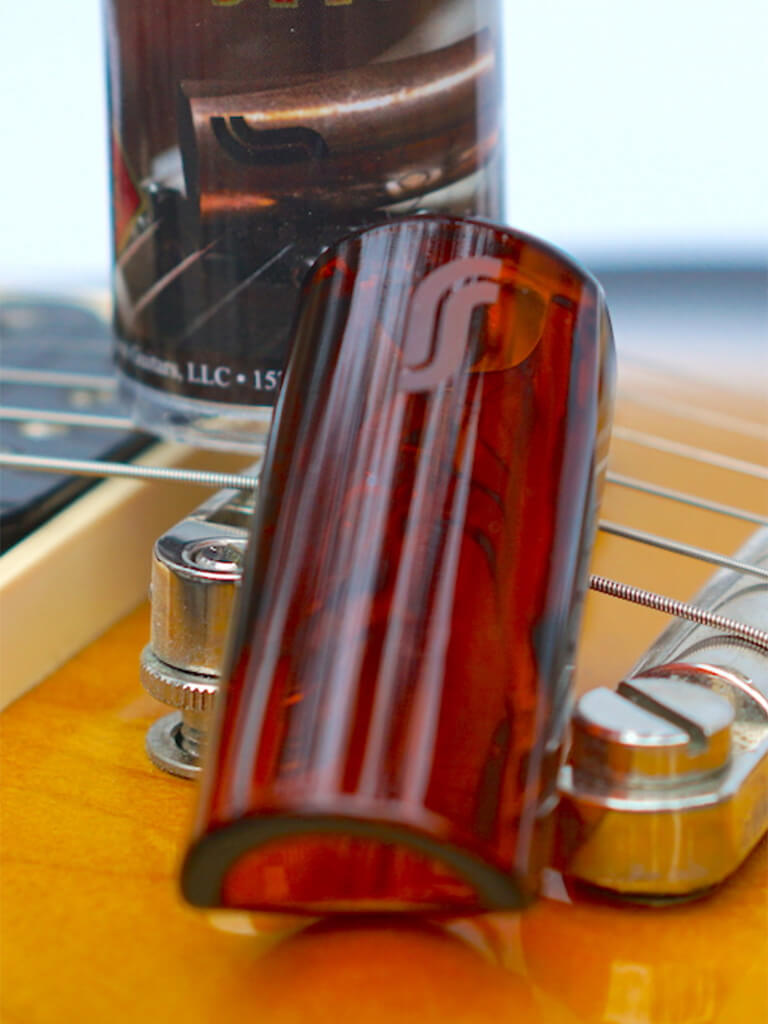 Rhett’s custom Amber slide is based on our medium glass slide. It features a cool satin finger rest and sandblasted logo. All the other features like the tapered interior and knuckle cutaway remain the same.