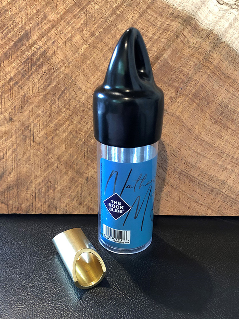This brass ring slide is based on our small size brass slide, with most of the top chopped off. It measures 1.5″ total length with about 1″ playing surface. Great for throwing in slide licks while keeping your fingers free to play fretted notes.
