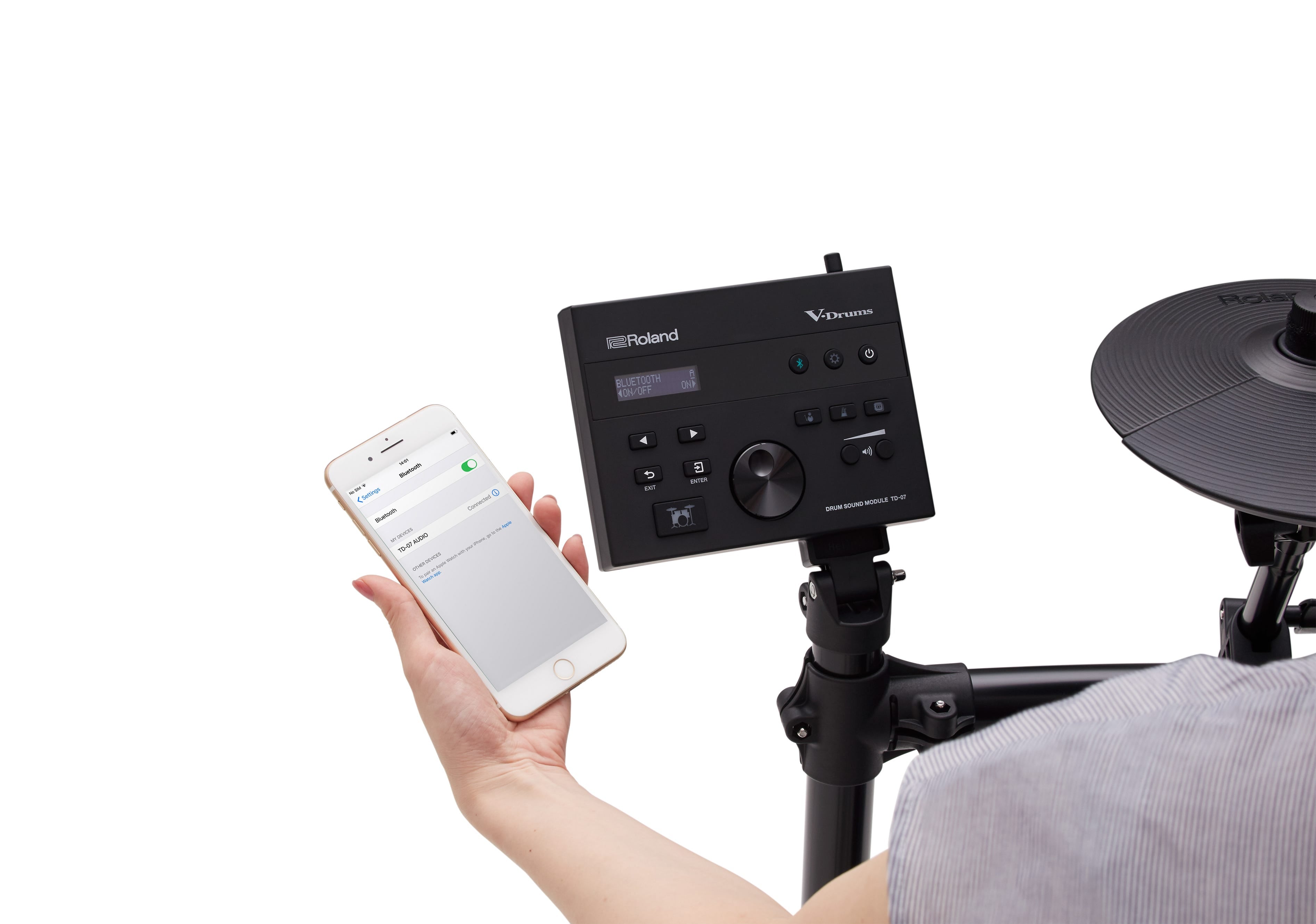 Play Along with Music Over Bluetooth Drumming with favorite tracks is one of the most fun and productive things you can do with an electronic kit, and the TD-07KV makes it easy. Thanks to onboard Bluetooth, you can call up tracks on your smartphone, tablet, or computer and wirelessly hear the audio through the module right alongside the drums. Video sound is transmitted too, perfect for playing along with online songs and lesson content. And if you don’t have a Bluetooth device, you can bring in stereo sound with a cable. MIDI transmission over Bluetooth is also supported, allowing you to record MIDI data in music apps cable-free.