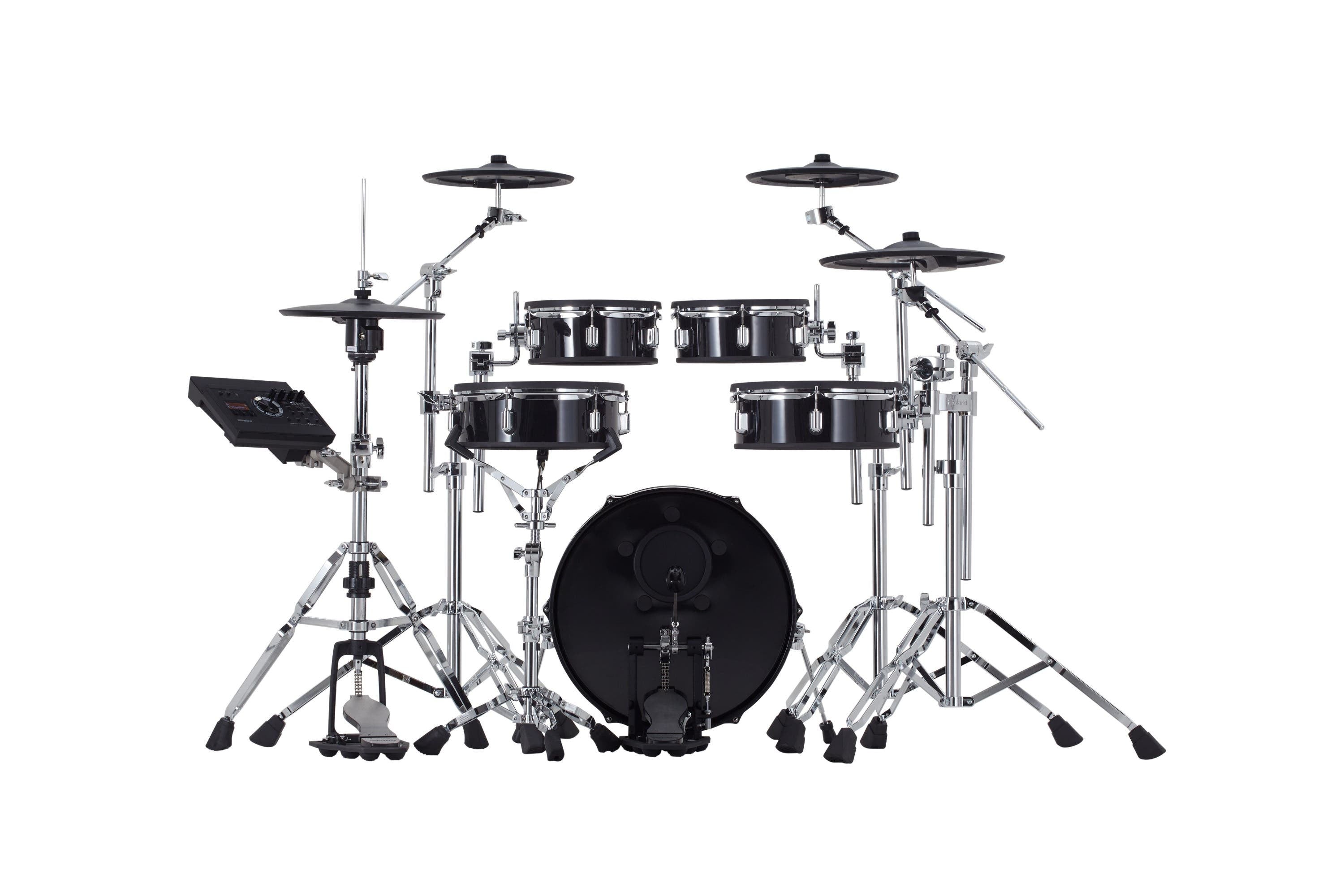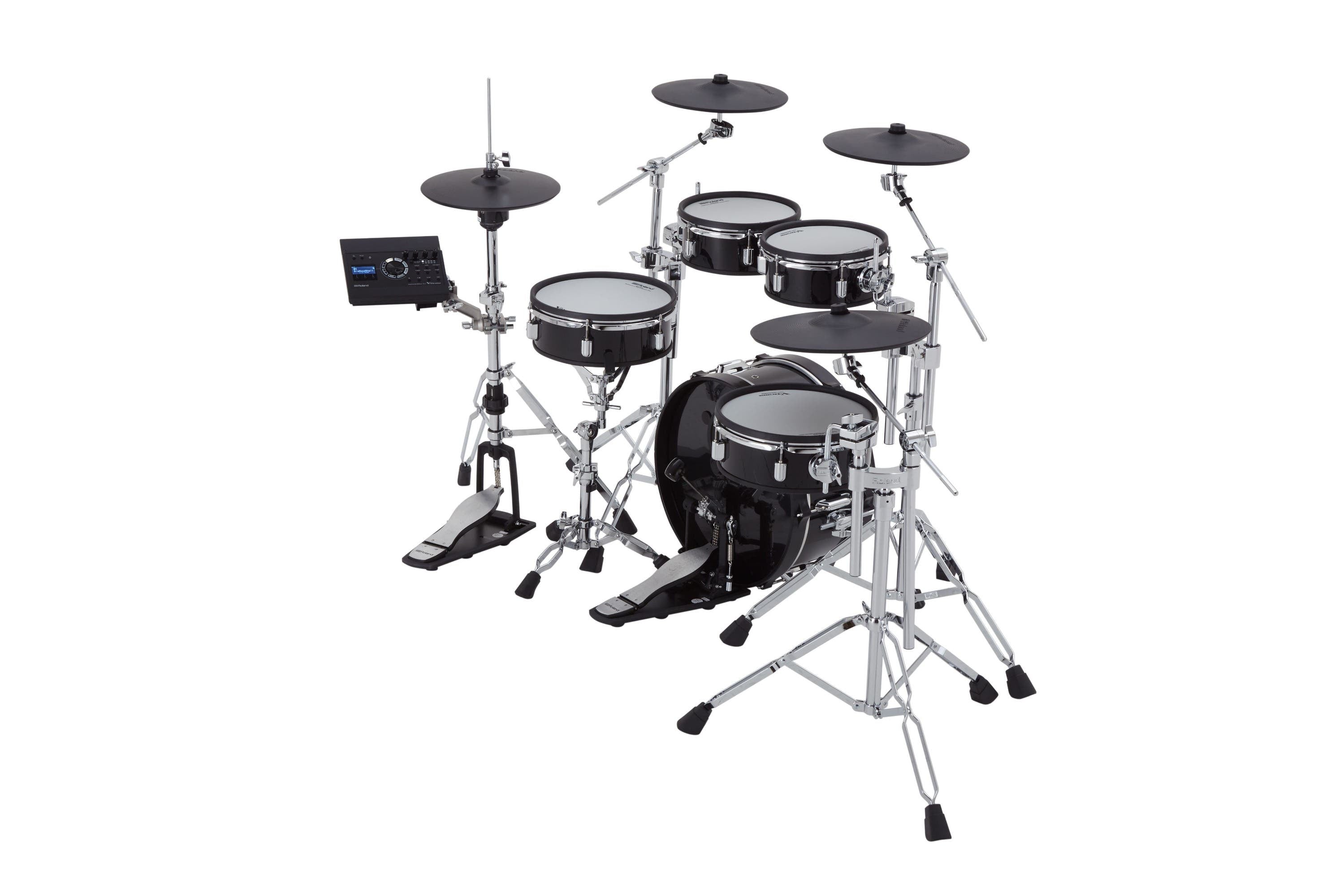 • Space-saving V-Drums Acoustic Design kit with shallow-depth wood shells and upgraded double-braced chrome stands