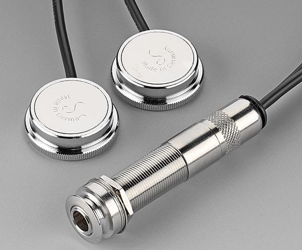 The 10/83 is effectively the dual version of the 10/82 - also with a jack socket, but with two pickups. Like the 10/82 it is also designed for internal installation. According to the instrument, the pickups can be mounted in the best possible locations, which allows a perfect pick-up of the lows and at the same time an optimal reproduction of the high frequencies, e.g. on the inside at the bridge and on the side or the bottom of the instrument - depending on how much bass and treble you want.