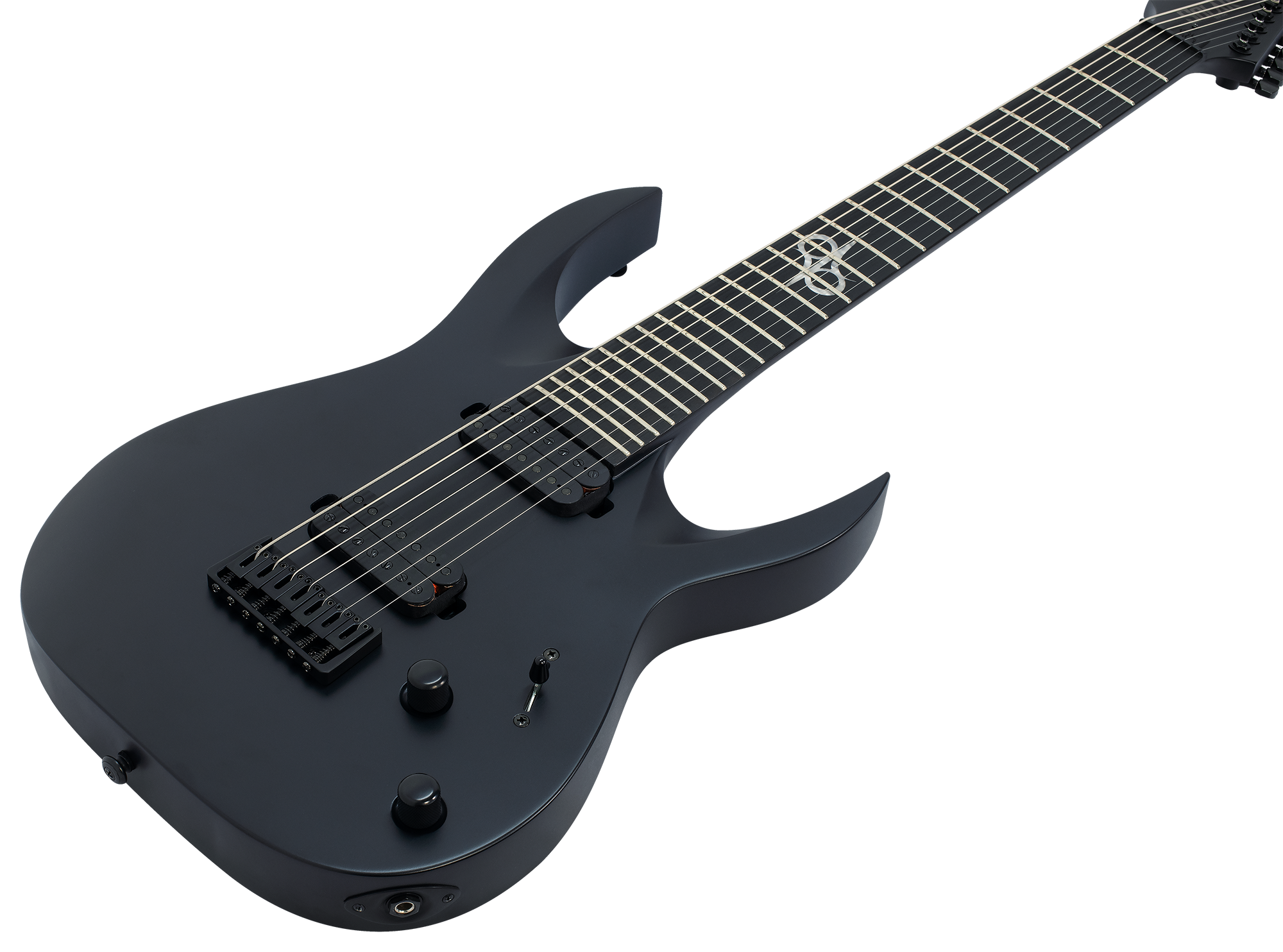 This Type A2.7 seven-string guitar boasts stealth looks, a distinctive cutaway scoop and a remarkable feature set, making it a precise, professional instrument suitable for both stage and studio work. It comes loaded with a reliable string-through-body hardtail bridge and Duncan Solar pickups that provide a full spectrum of tonal options, from organic clean to heavily overdriven, all with fluid sustain and maximum clarity. The Type A2.7 features a set-thru neck/body joint design with 26.5” scale, a mahogany body, a fast, thin, comfortable maple neck and an ebony fingerboard with 24 super-jumbo frets. This guitar includes Solar 18:1 tuners, PPS nut, black matte hardware, five-way blade pickup switching and full access neck. Available in carbon black matte finish.