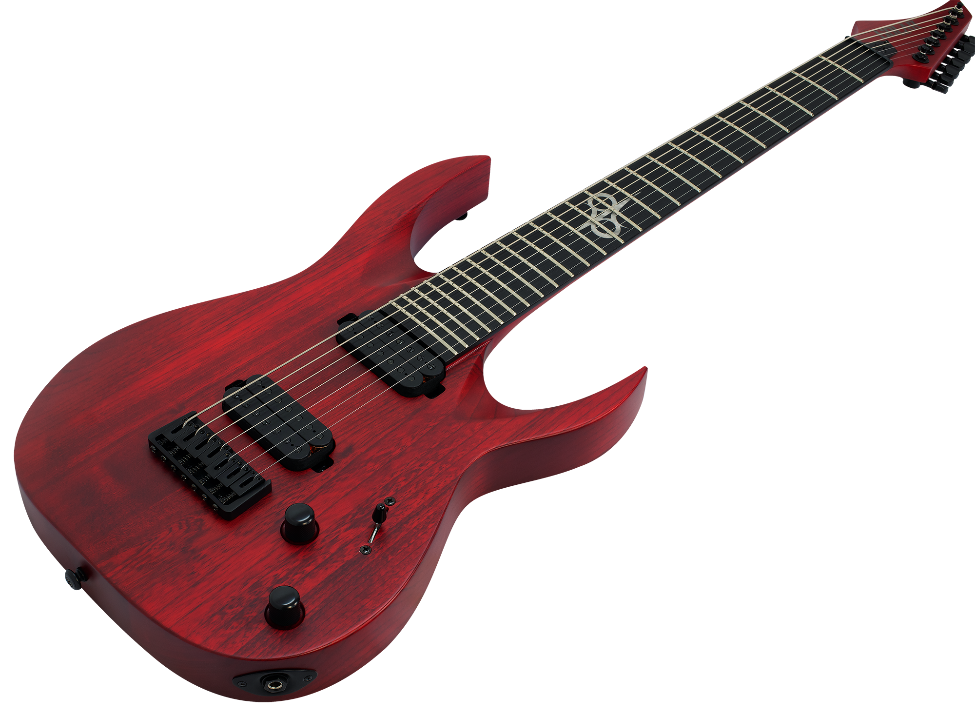 This Type A2.7TBR seven-string guitar boasts stealth looks, a distinctive cutaway scoop and a remarkable feature set, making it a precise, professional instrument suitable for both stage and studio work. It comes loaded with a reliable string-through-body hardtail bridge and Duncan Solar pickups that provide a full spectrum of tonal options, from organic clean to heavily overdriven, all with fluid sustain and maximum clarity. The Type A2.7 features a set-thru neck/body joint design with 26.5” scale, sungkai ash body, a fast, thin, comfortable maple neck and a rosewood fingerboard with 24 super-jumbo frets. This guitar includes Solar 18:1 tuners, PPS nut, black matte hardware, five-way blade pickup switching and full access neck. Available in trans blood red matte finish.