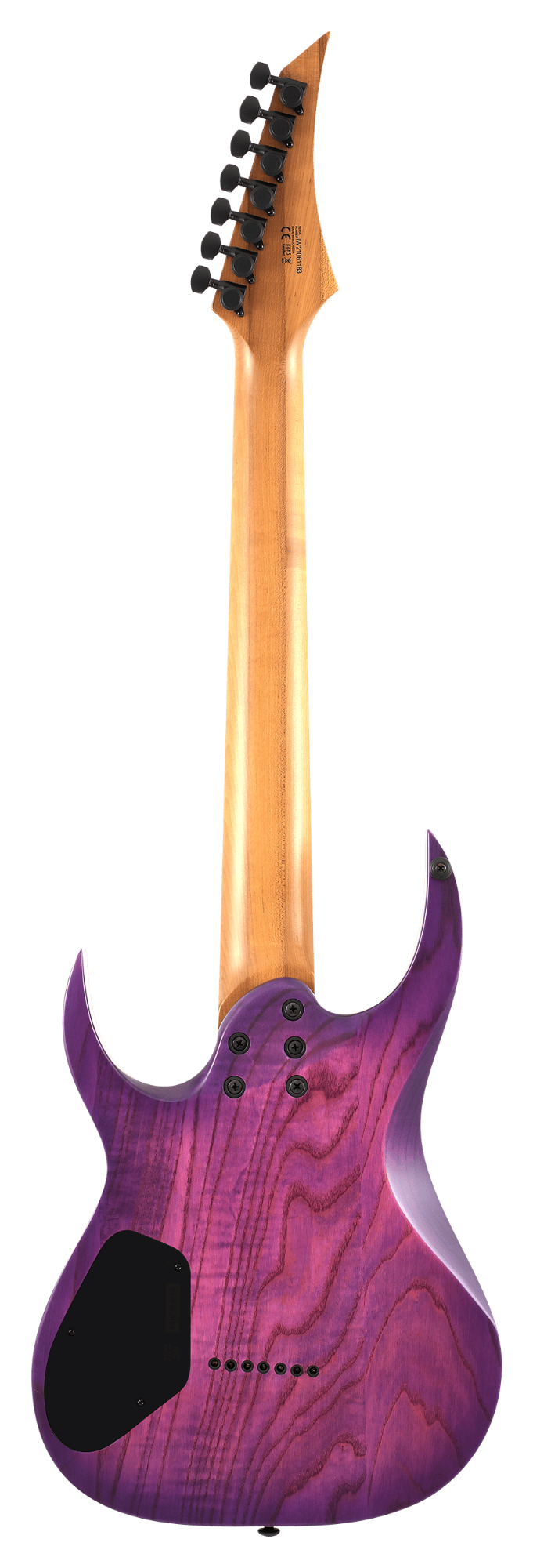 This Type AB1.7HTPB seven-string bolt-on guitar boasts stealth looks, a distinctive cutaway scoop and a remarkable feature set, making it the ultimate, precise and professional instrument suitable for both stage and studio work. This guitar is loaded with a Hipshot USA fixed bridge and is loaded with Duncan Solar pickups that provide a full spectrum of tonal options, from organic clean to heavily overdriven, all with fluid sustain and maximum clarity. The Type AB1.7HTPB features a bolt-on neck joint design with 25.5” scale, an swamp ash body, a fast, thin, comfortable roasted maple neck, a roasted maple fingerboard with 24 super-jumbo stainless steel frets, Luminlay ‘glow in the dark’ side dots for easy stage use. Loaded with Solar 18:1 locking tuners, PPS nut, 3-way blade switch with volume and tone with push pull for series parallel pickup switching. Available in trans purple burst matte finish.