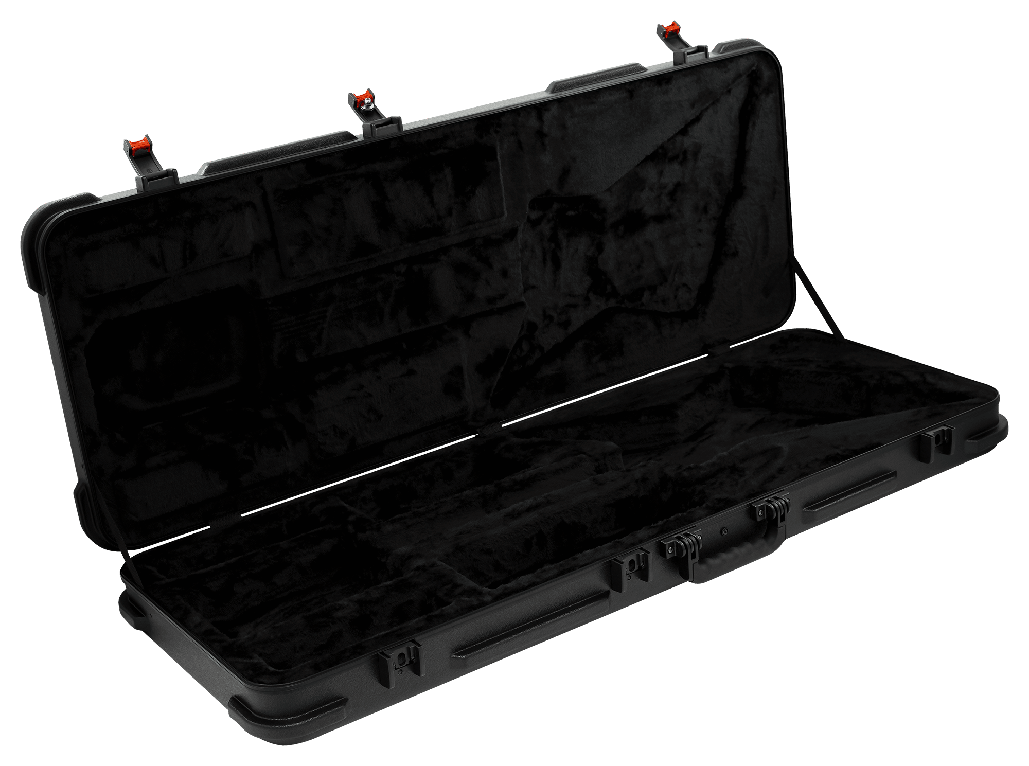 ABS Molded, custom fitted, instrument case with 4 internal storage compartments, heavy duty handle, TSA latches, lockable with black aluminum trim and customized for Solar Type E guitars.