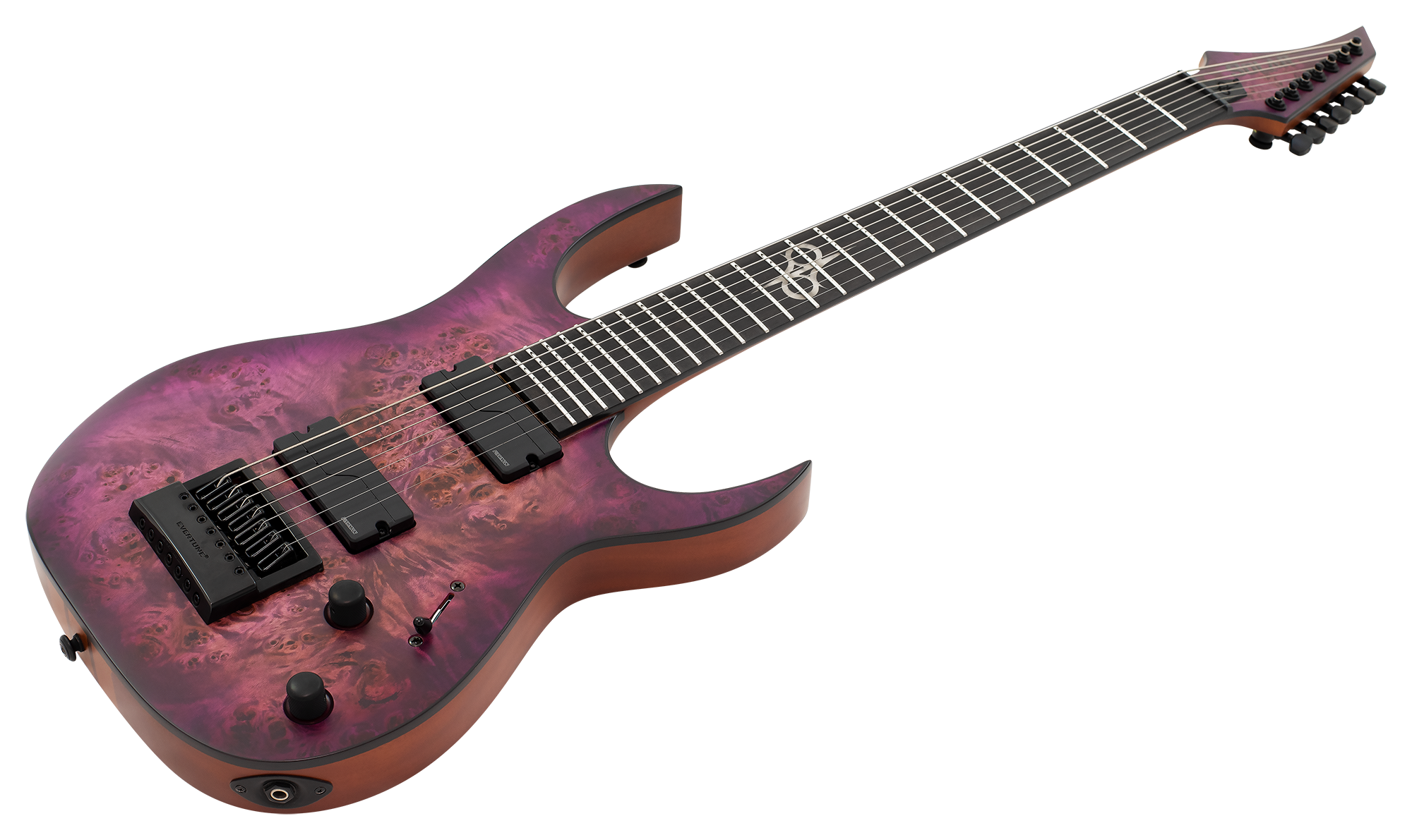 This Type S1.7A 7-string Poplar Burl guitar combines our dedicated craftsmanship, skill and care for detail with a remarkable feature set, making it the ultimate, precise and professional instrument suitable for both stage and studio work. The S1.7 features the Evertune® constant-tension bridge—a reliable, fully-mechanical system that keeps the guitar in tune under any circumstances and a pair of Fishman Fluence Modern active humbucker pickups revealing pure, uncorrupted and musical tone.This Type S1.7 guitar has a neck-through construction with 26.5” scale, a poplar burl veneer over mahogany body with black binding, a fast C-shaped thin 5-ply maple/jatoba neck, an ebony fingerboard with 24 super-jumbo stainless steel frets and Luminlay ‘glow in the dark’ side dots for easy stage use. It comes loaded with Solar 18:1 locking tuners, PPS nut, 3-way blade pickup switching with push-pull tone knob for voice selection and full access neck. Available in purple burst matte finish. 9V Battery is not included.