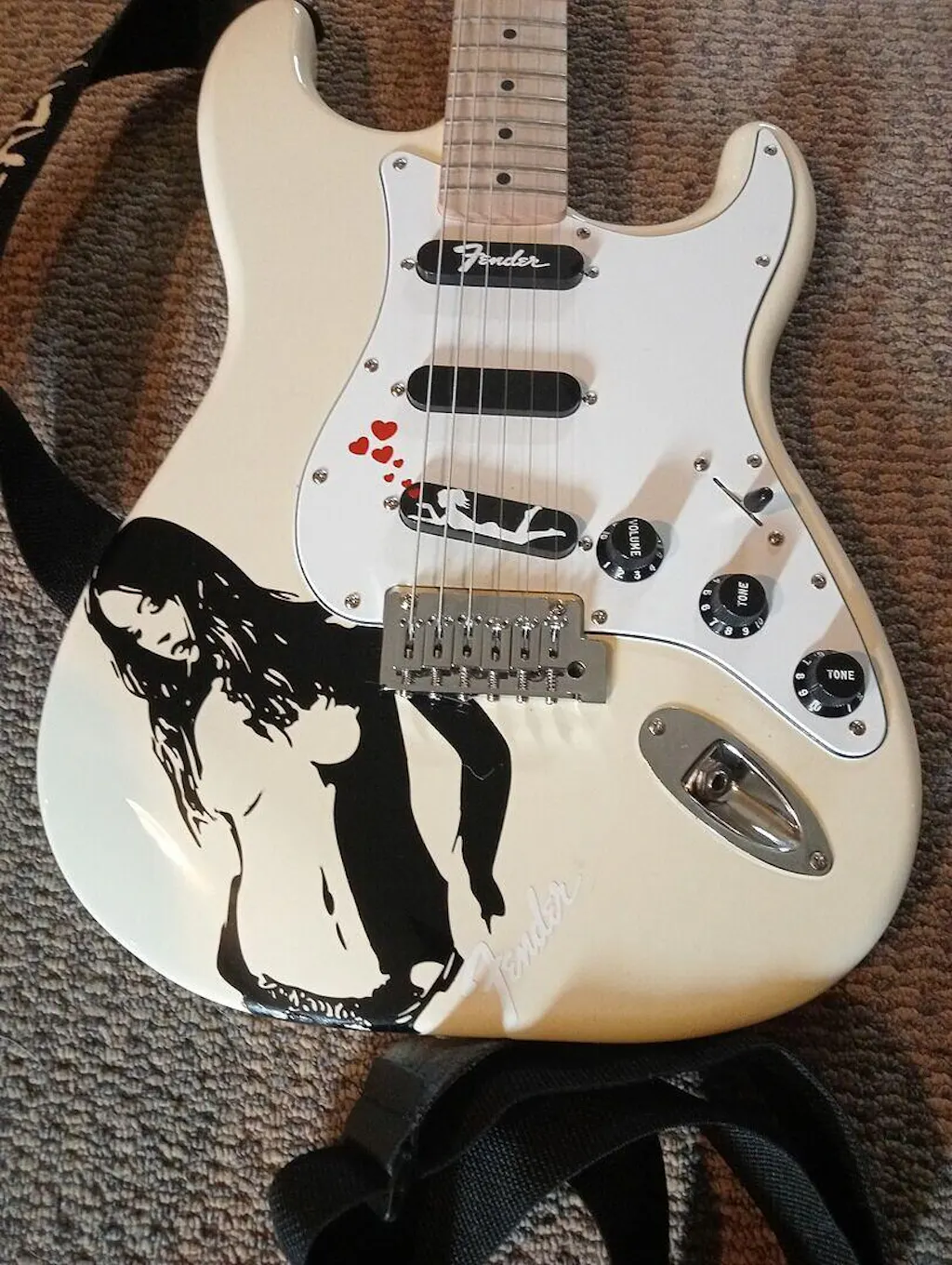 Black pickup covers I had lying around, graphics I did myself. The locking tuners made a world of difference immediately as did decking the bridge and the switch is of a much higher quality than the cheap thing that came out if it. Worth working on these guitars, good from factory but looks plays and sounds beautiful after a few small mods.