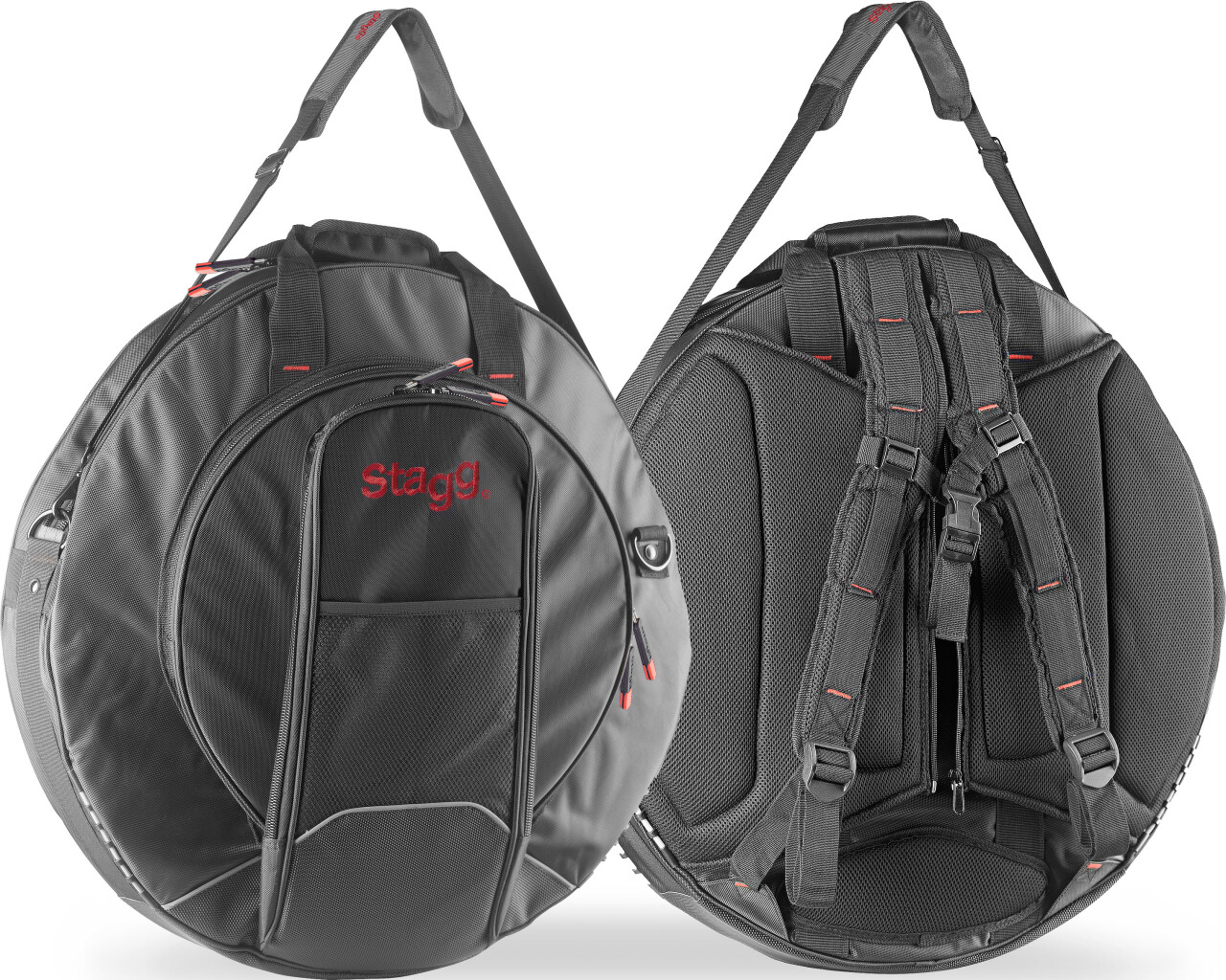 Reinforced black nylon with plush foam padded interior 4-tier main compartment for different size categories Separate 16" 2-tier compartment for hi-hat/splash cymbals External pouch for drumsticks & small accessories 2 x backstraps under zippered protection cover Heavy "comfort" handle Shoulder handle with strap