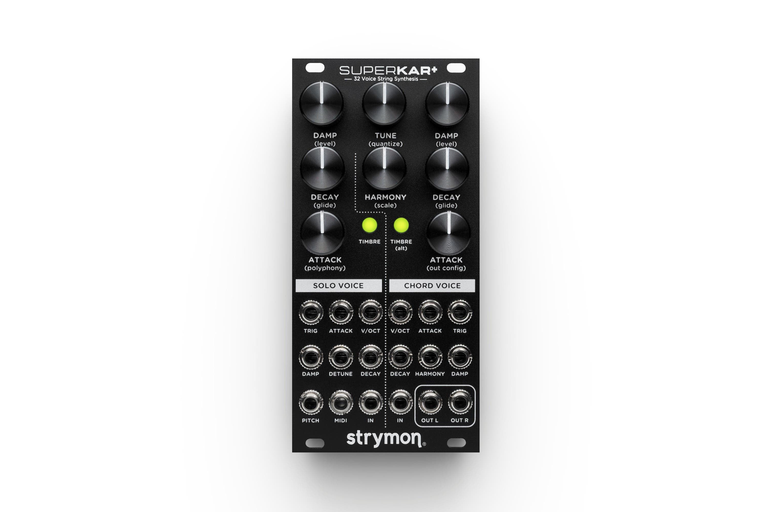 Self-Contained Voice Module The nature of Karplus-Strong synthesis means that you won’t need to dedicate VCAs or amplifier envelopes to SuperKar+. Independent attack, decay and damping are included for both the Solo and Chord voices, and the module also includes an internal mixer with independent output levels for both voices, as well as multiple stereo and mono audio output modes.